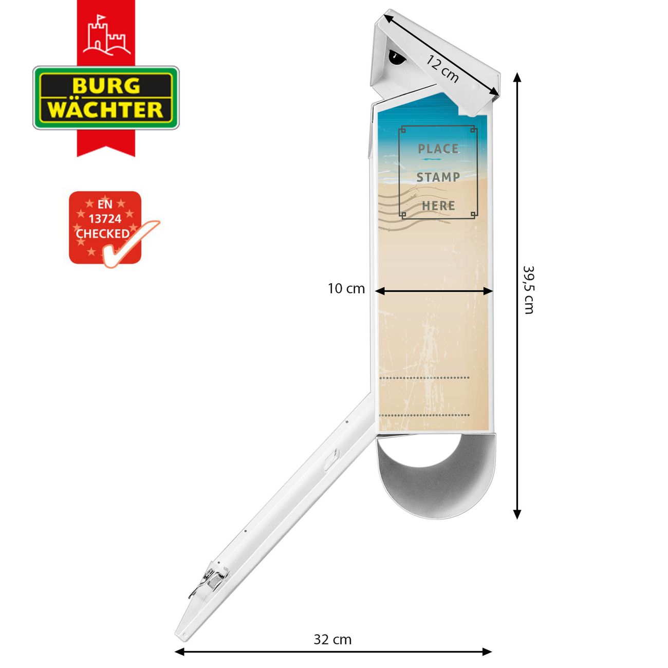 Der BURG-WÄCHTER Stahl Briefkasten mit Postkarte Motiv bietet Ihnen mit seinem Fassungsvermögen genügend Platz auch für große A4 Sendungen und Zeitschriften. Das integrierte Regendach schützt Ihre Post vor dem Eindringen von Regen.