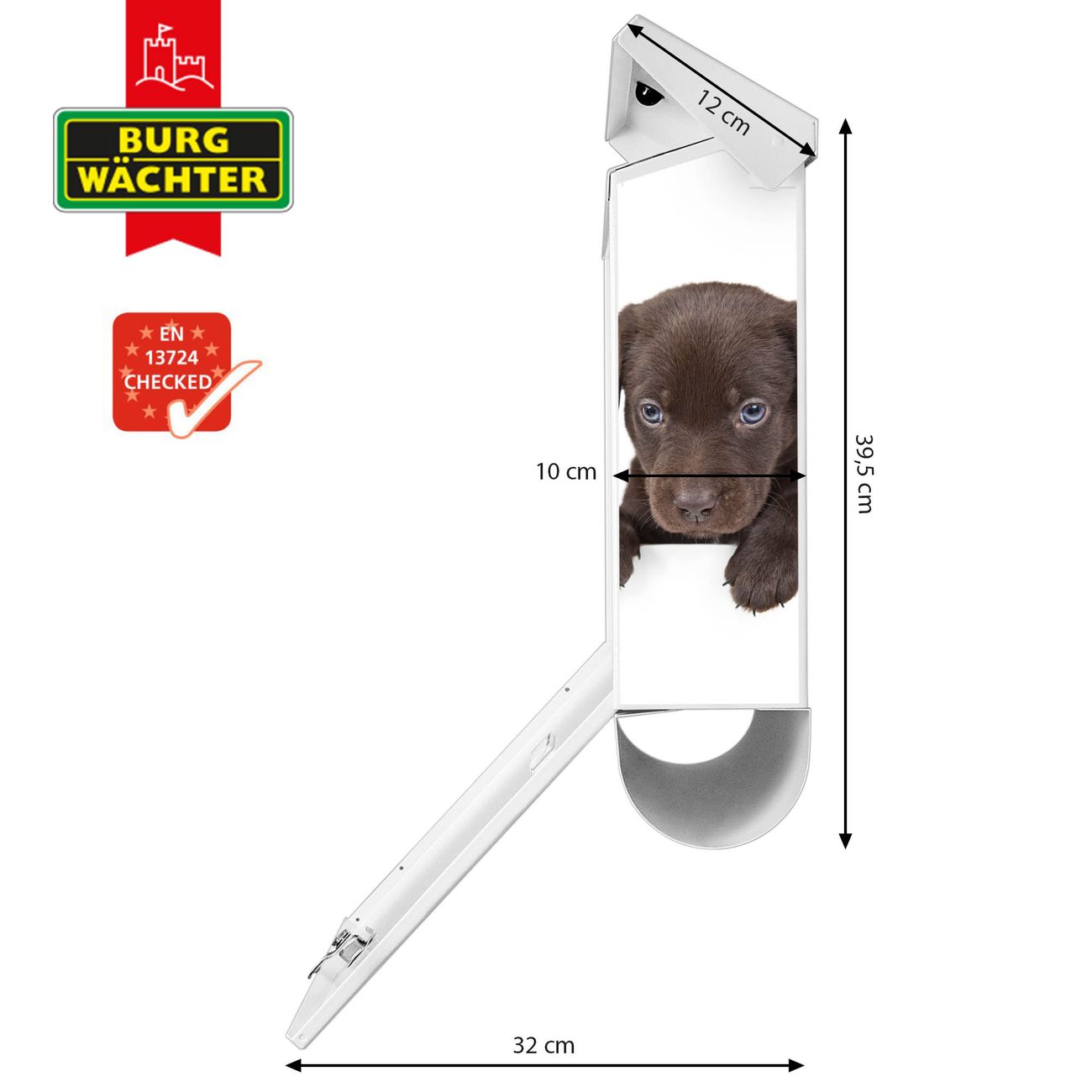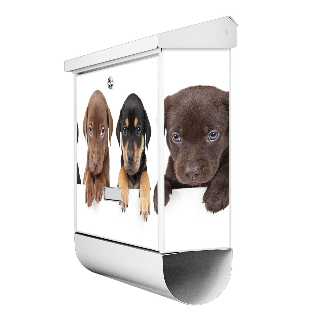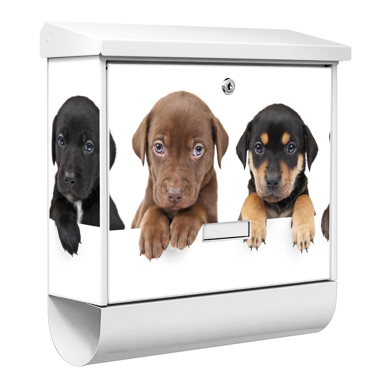 Der BURG-WÄCHTER Stahl Briefkasten mit Puppies Motiv bietet Ihnen mit seinem Fassungsvermögen genügend Platz auch für große A4 Sendungen und Zeitschriften. Das integrierte Regendach schützt Ihre Post vor dem Eindringen von Regen.