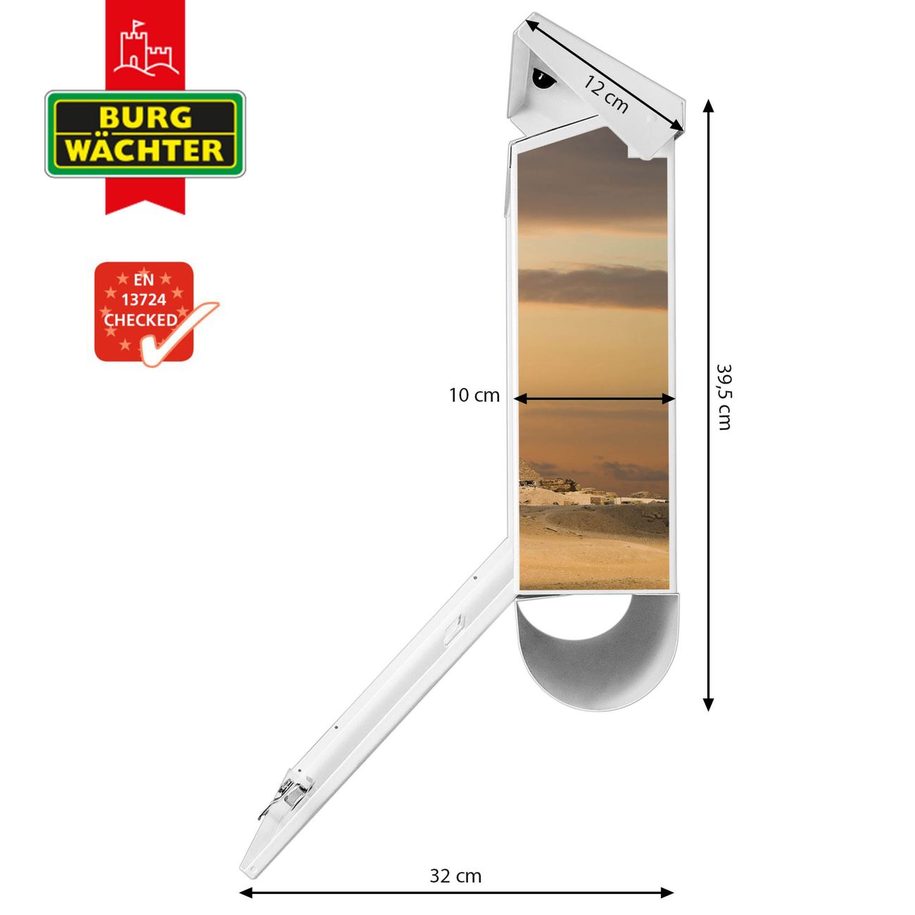 Der BURG-WÄCHTER Stahl Briefkasten mit Pyramiden Motiv bietet Ihnen mit seinem Fassungsvermögen genügend Platz auch für große A4 Sendungen und Zeitschriften. Das integrierte Regendach schützt Ihre Post vor dem Eindringen von Regen.