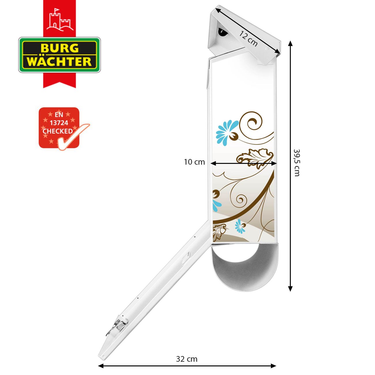 Der BURG-WÄCHTER Stahl Briefkasten mit Rankenrahmen Motiv bietet Ihnen mit seinem Fassungsvermögen genügend Platz auch für große A4 Sendungen und Zeitschriften. Das integrierte Regendach schützt Ihre Post vor dem Eindringen von Regen.