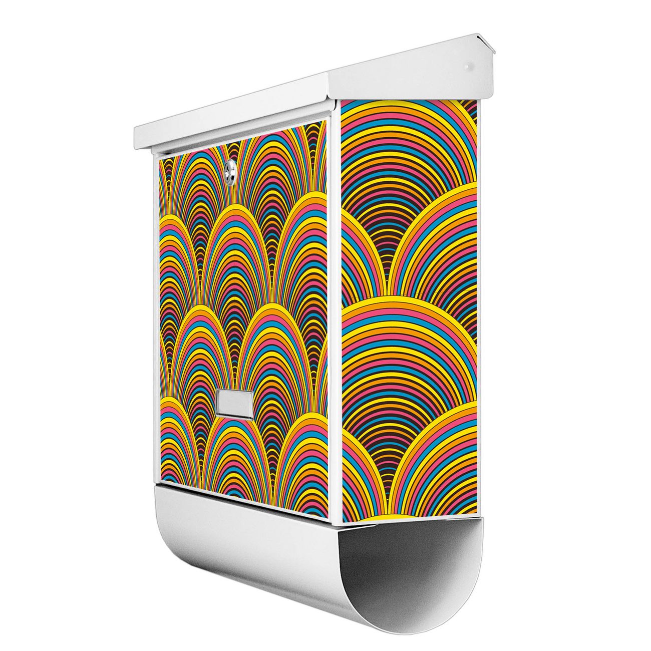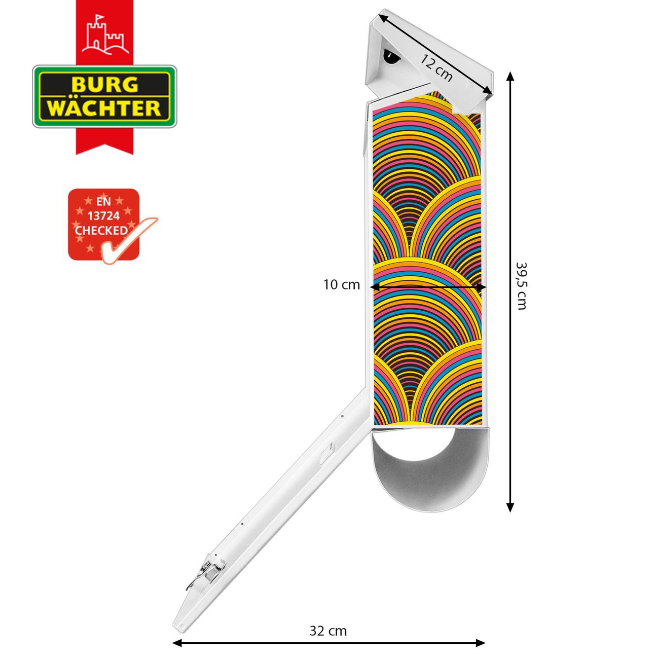 Der BURG-WÄCHTER Stahl Briefkasten mit Regenbögen Motiv bietet Ihnen mit seinem Fassungsvermögen genügend Platz auch für große A4 Sendungen und Zeitschriften. Das integrierte Regendach schützt Ihre Post vor dem Eindringen von Regen.