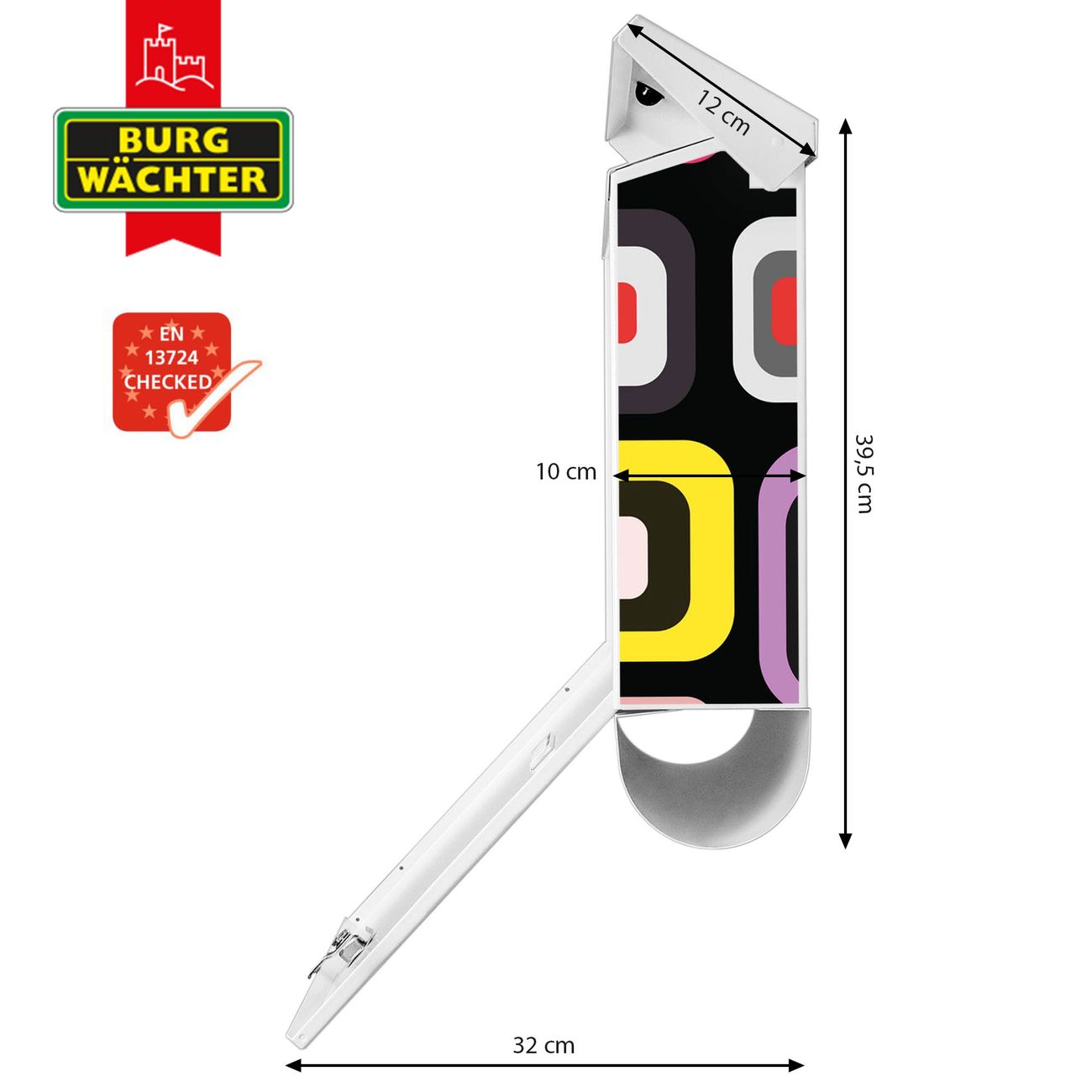 Der BURG-WÄCHTER Stahl Briefkasten mit Retro Motiv bietet Ihnen mit seinem Fassungsvermögen genügend Platz auch für große A4 Sendungen und Zeitschriften. Das integrierte Regendach schützt Ihre Post vor dem Eindringen von Regen.