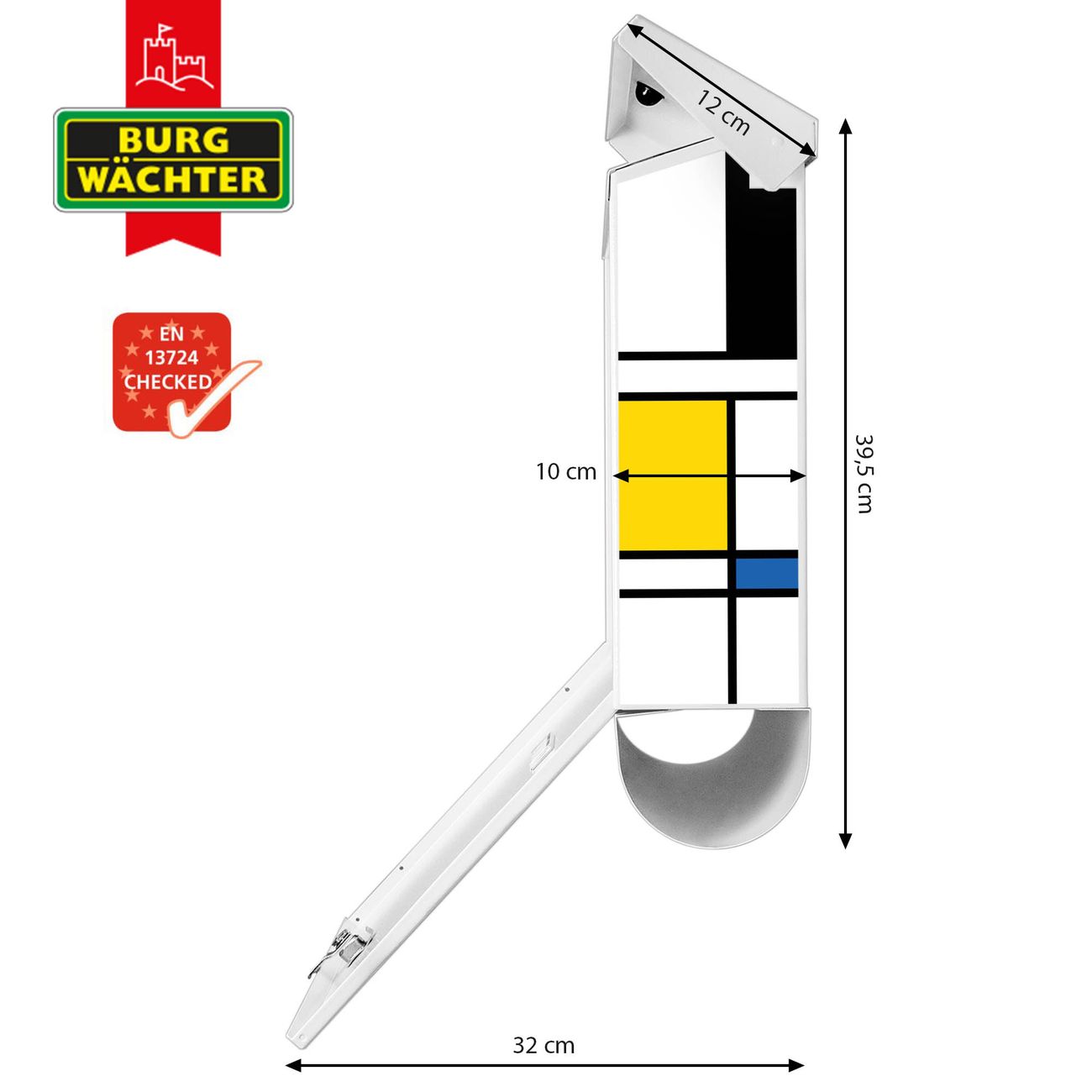 Der BURG-WÄCHTER Stahl Briefkasten mit Rot Gelb Blau Motiv bietet Ihnen mit seinem Fassungsvermögen genügend Platz auch für große A4 Sendungen und Zeitschriften. Das integrierte Regendach schützt Ihre Post vor dem Eindringen von Regen.