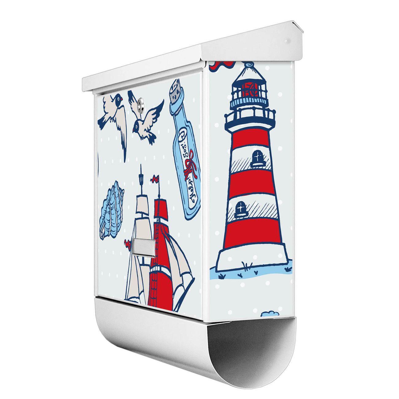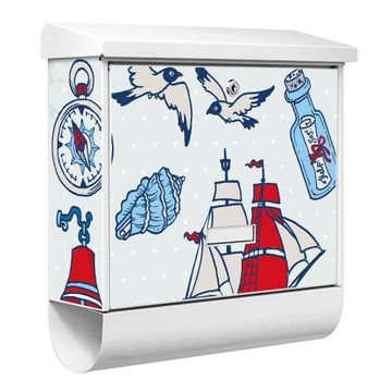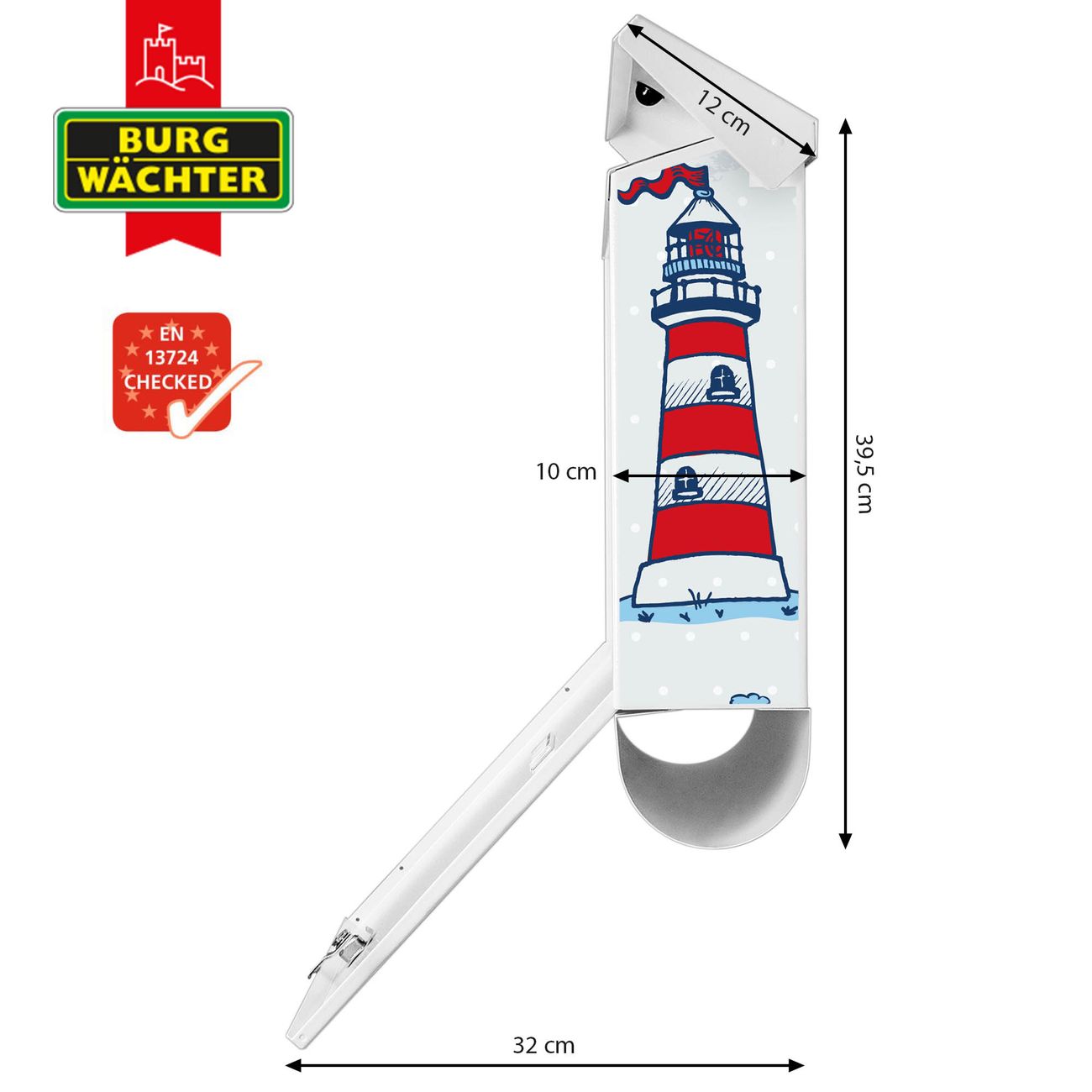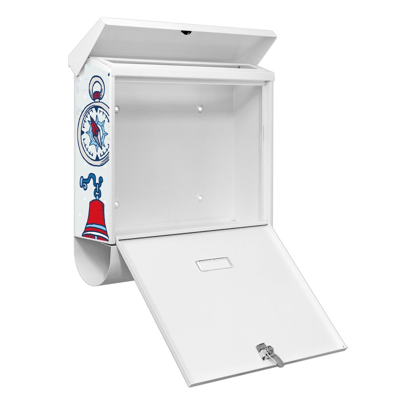 Der BURG-WÄCHTER Stahl Briefkasten mit Schiff Ahoj Motiv bietet Ihnen mit seinem Fassungsvermögen genügend Platz auch für große A4 Sendungen und Zeitschriften. Das integrierte Regendach schützt Ihre Post vor dem Eindringen von Regen.