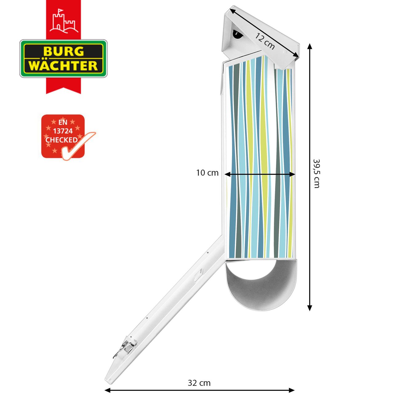 Der BURG-WÄCHTER Stahl Briefkasten mit Schilf Abstrakt Motiv bietet Ihnen mit seinem Fassungsvermögen genügend Platz auch für große A4 Sendungen und Zeitschriften. Das integrierte Regendach schützt Ihre Post vor dem Eindringen von Regen.