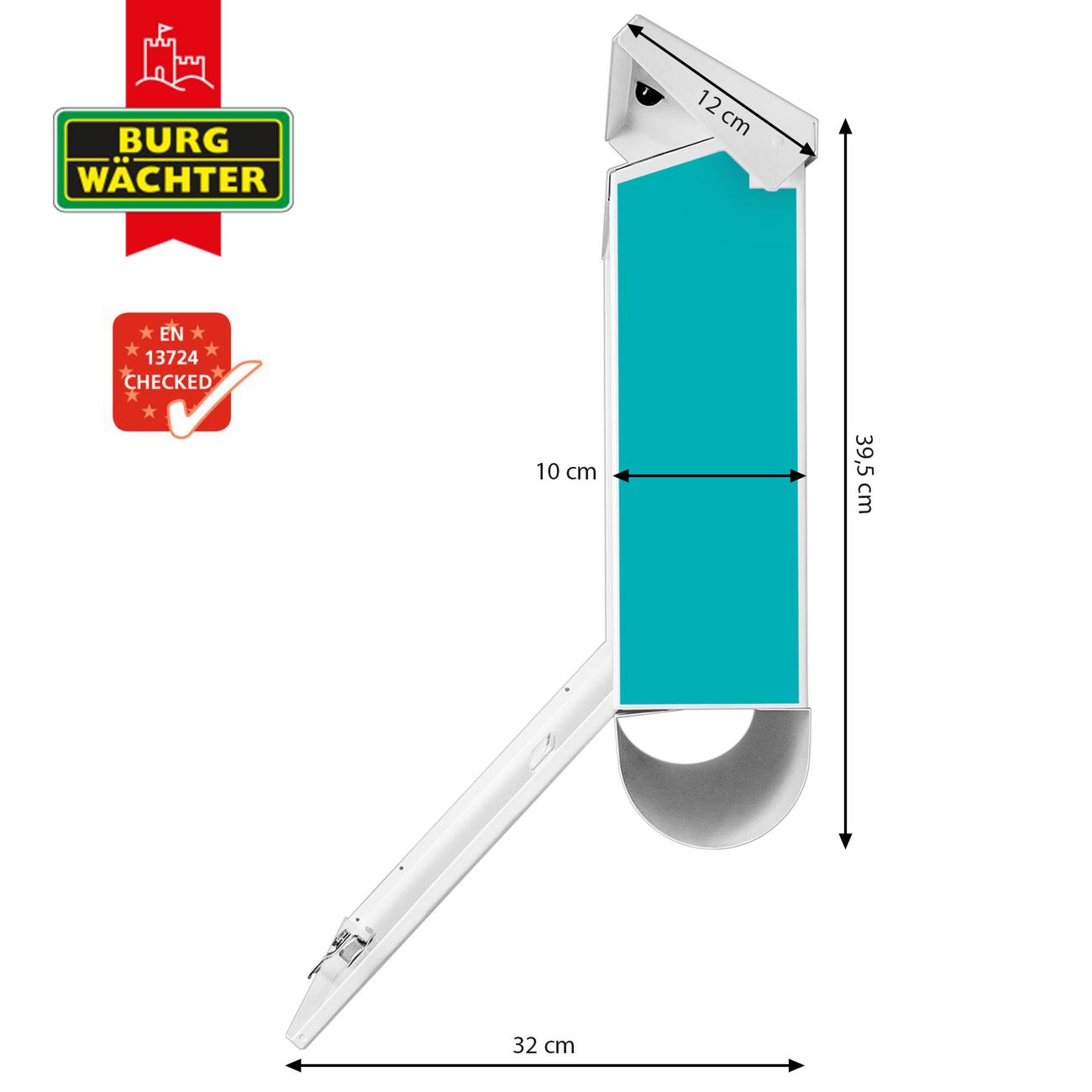 Der BURG-WÄCHTER Stahl Briefkasten mit Schwerelos Motiv bietet Ihnen mit seinem Fassungsvermögen genügend Platz auch für große A4 Sendungen und Zeitschriften. Das integrierte Regendach schützt Ihre Post vor dem Eindringen von Regen.