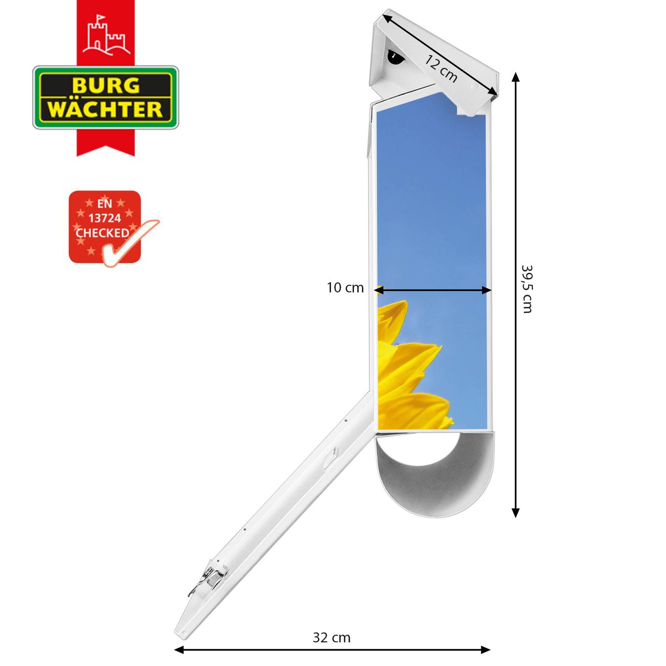 Der BURG-WÄCHTER Stahl Briefkasten mit Sonnenblume Motiv bietet Ihnen mit seinem Fassungsvermögen genügend Platz auch für große A4 Sendungen und Zeitschriften. Das integrierte Regendach schützt Ihre Post vor dem Eindringen von Regen.