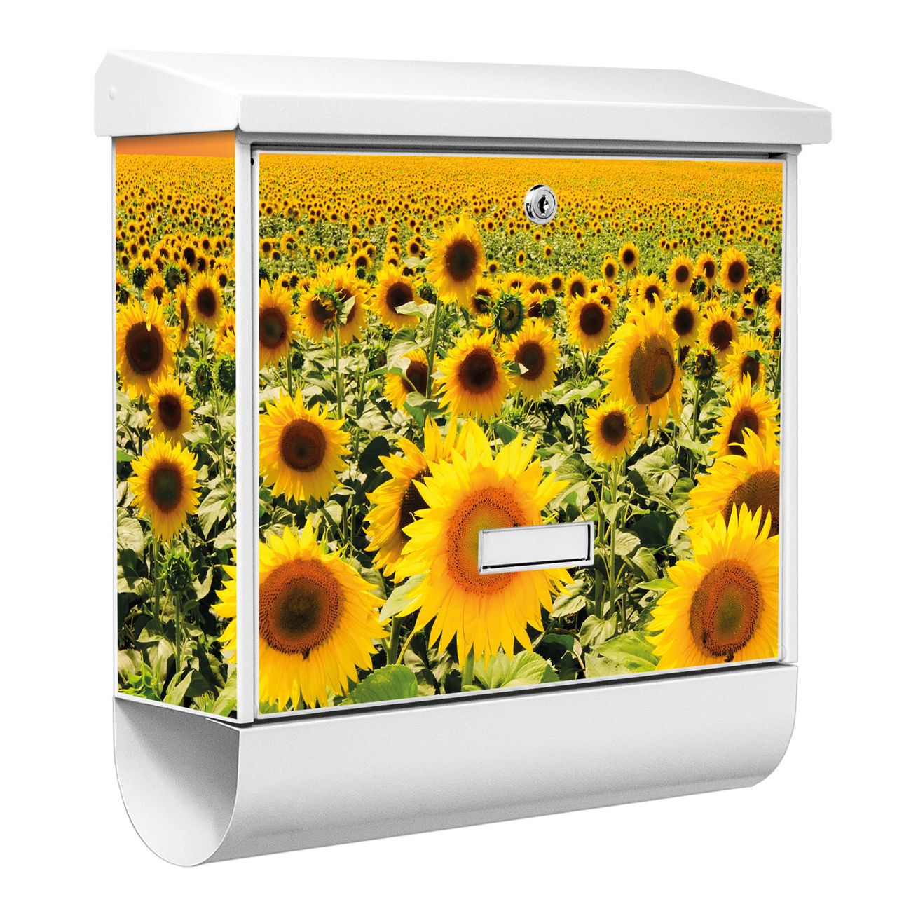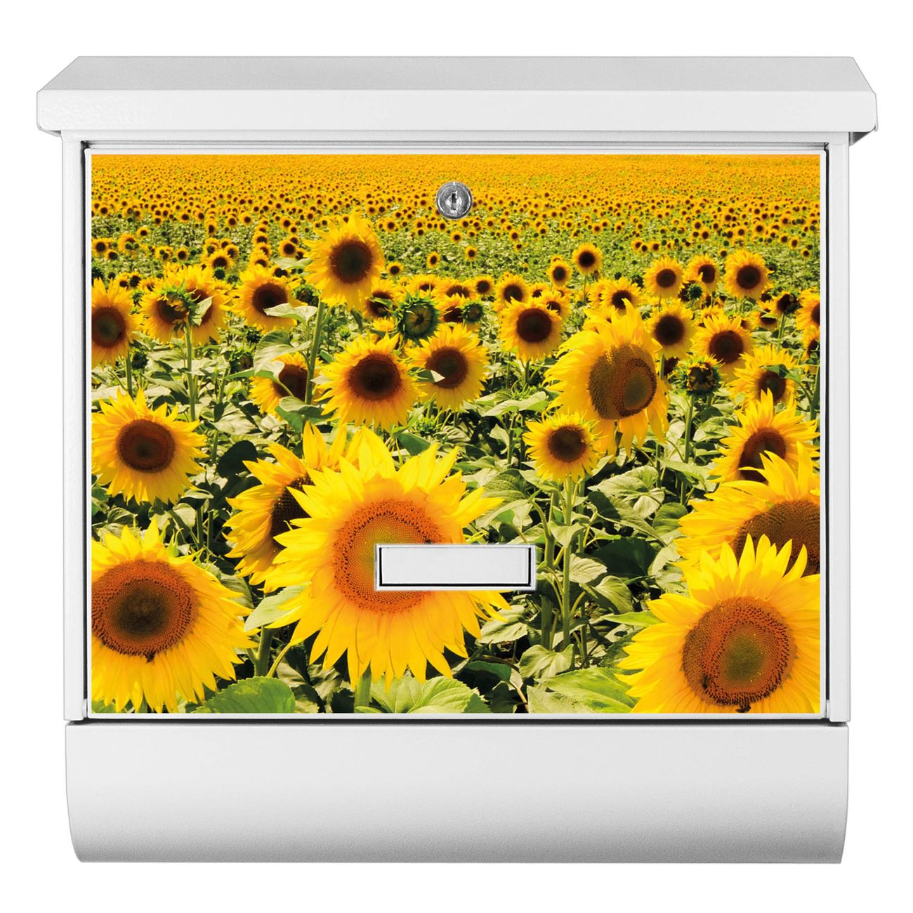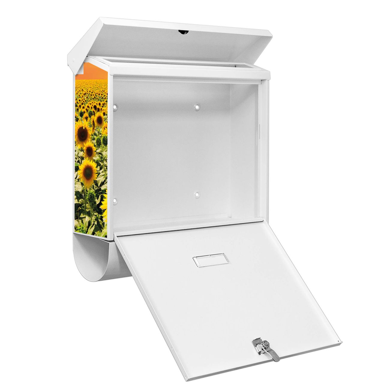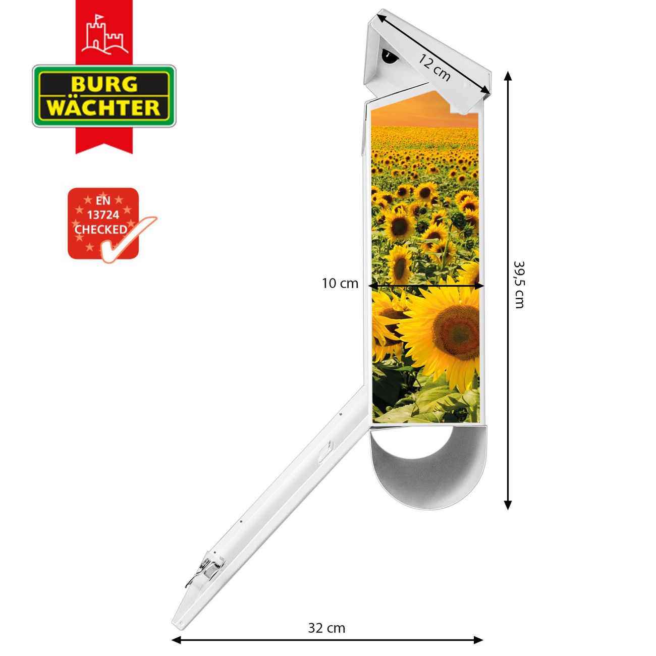 Der BURG-WÄCHTER Stahl Briefkasten mit Sonnenblumenmeer Motiv bietet Ihnen mit seinem Fassungsvermögen genügend Platz auch für große A4 Sendungen und Zeitschriften. Das integrierte Regendach schützt Ihre Post vor dem Eindringen von Regen.