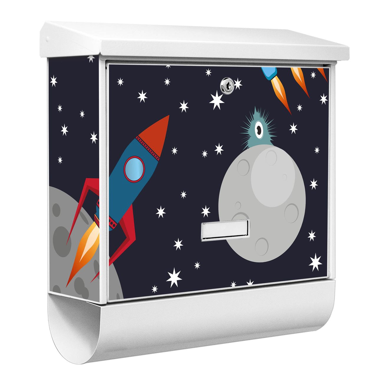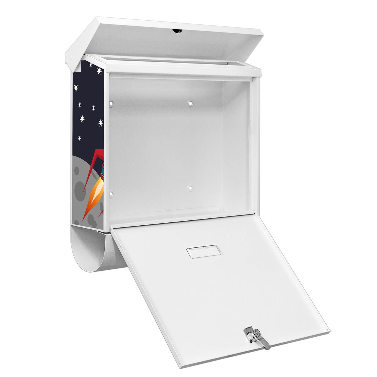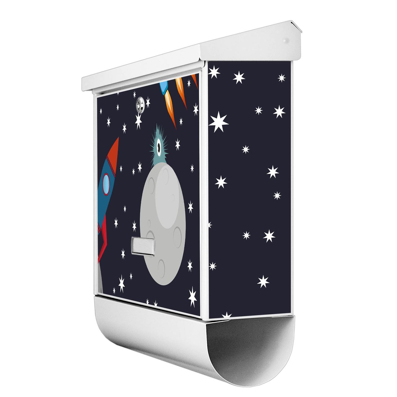 Der BURG-WÄCHTER Stahl Briefkasten mit Space Traffic Motiv bietet Ihnen mit seinem Fassungsvermögen genügend Platz auch für große A4 Sendungen und Zeitschriften. Das integrierte Regendach schützt Ihre Post vor dem Eindringen von Regen.