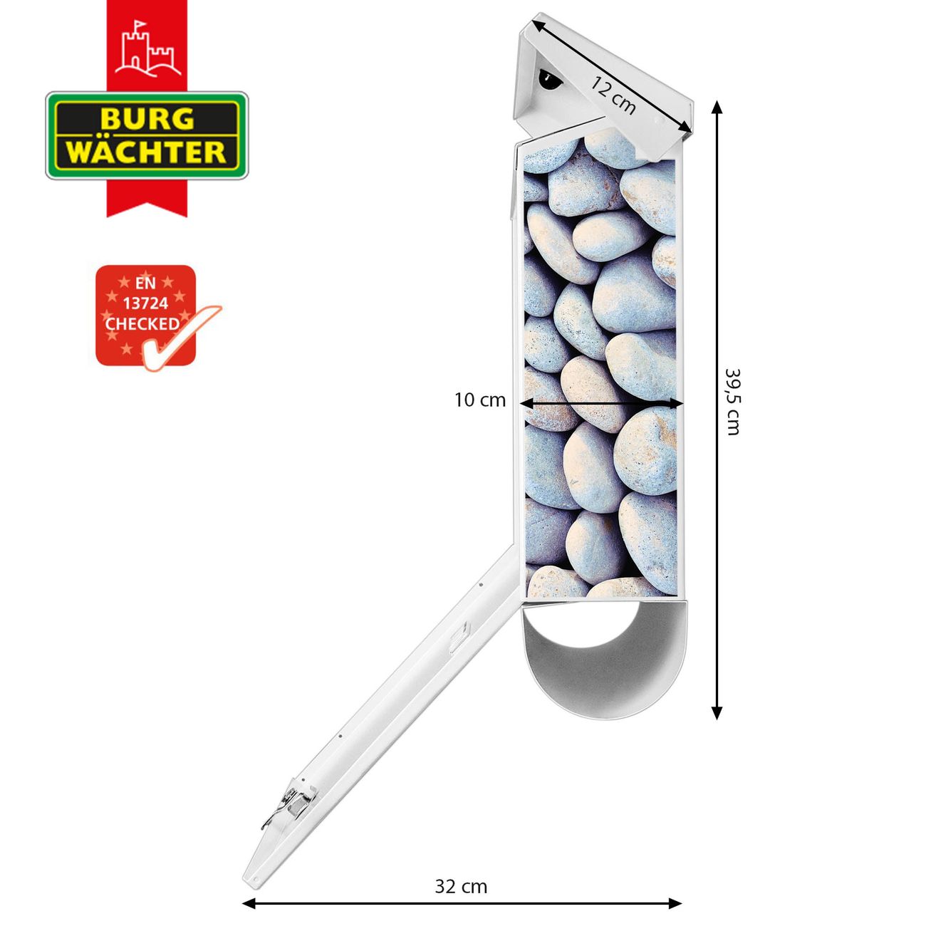 Der BURG-WÄCHTER Stahl Briefkasten mit Steinkreis Motiv bietet Ihnen mit seinem Fassungsvermögen genügend Platz auch für große A4 Sendungen und Zeitschriften. Das integrierte Regendach schützt Ihre Post vor dem Eindringen von Regen.