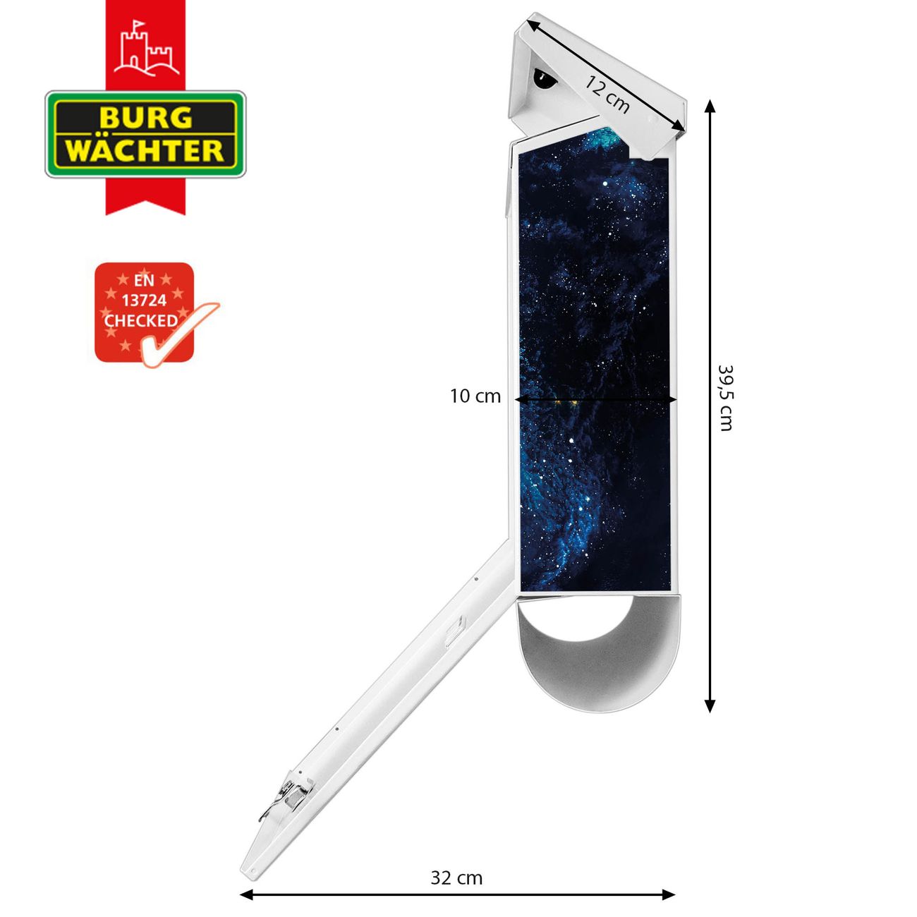Der BURG-WÄCHTER Stahl Briefkasten mit Sternenwirbel Motiv bietet Ihnen mit seinem Fassungsvermögen genügend Platz auch für große A4 Sendungen und Zeitschriften. Das integrierte Regendach schützt Ihre Post vor dem Eindringen von Regen.