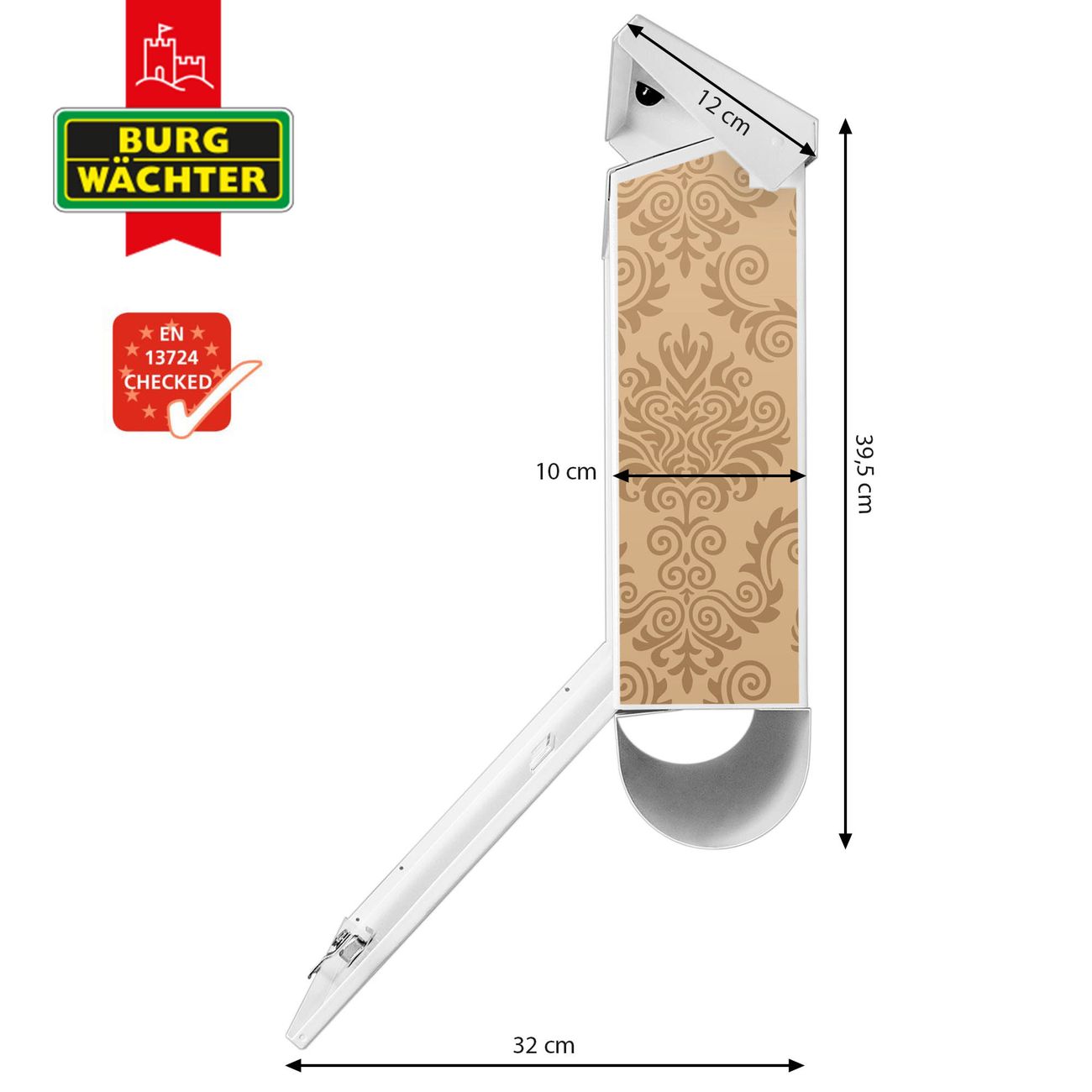 Der BURG-WÄCHTER Stahl Briefkasten mit Tapete Beige Motiv bietet Ihnen mit seinem Fassungsvermögen genügend Platz auch für große A4 Sendungen und Zeitschriften. Das integrierte Regendach schützt Ihre Post vor dem Eindringen von Regen.