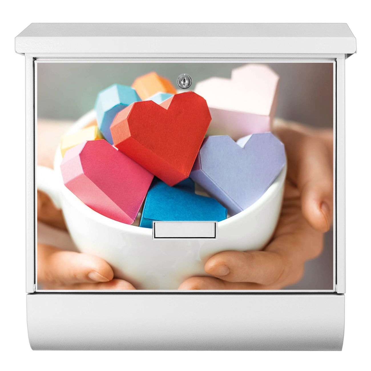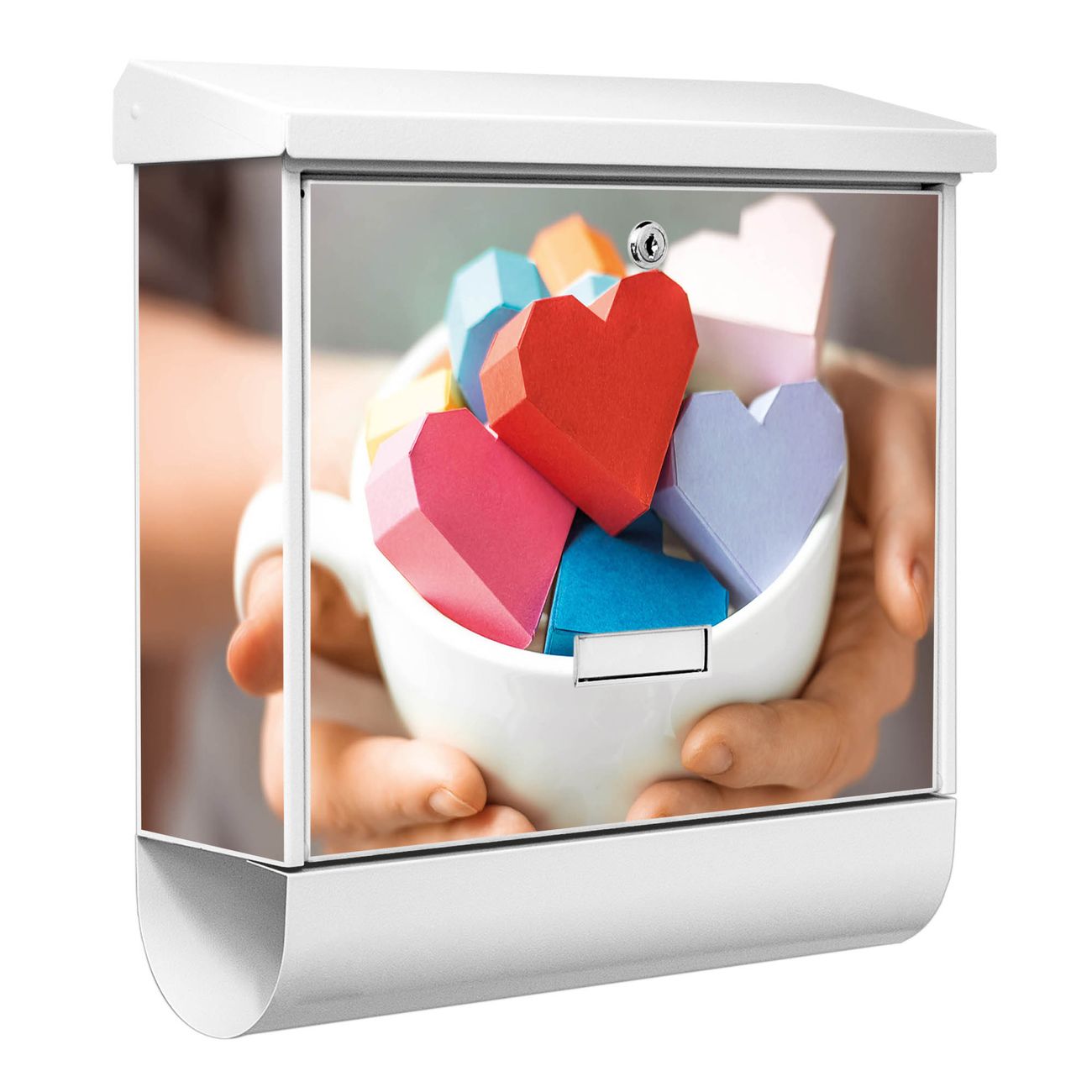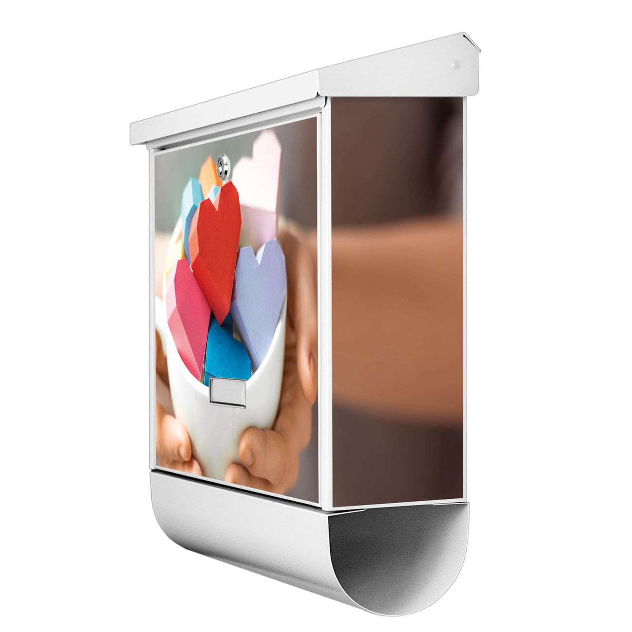 Der BURG-WÄCHTER Stahl Briefkasten mit Tasse voller Herzen Motiv bietet Ihnen mit seinem Fassungsvermögen genügend Platz auch für große A4 Sendungen und Zeitschriften. Das integrierte Regendach schützt Ihre Post vor dem Eindringen von Regen.