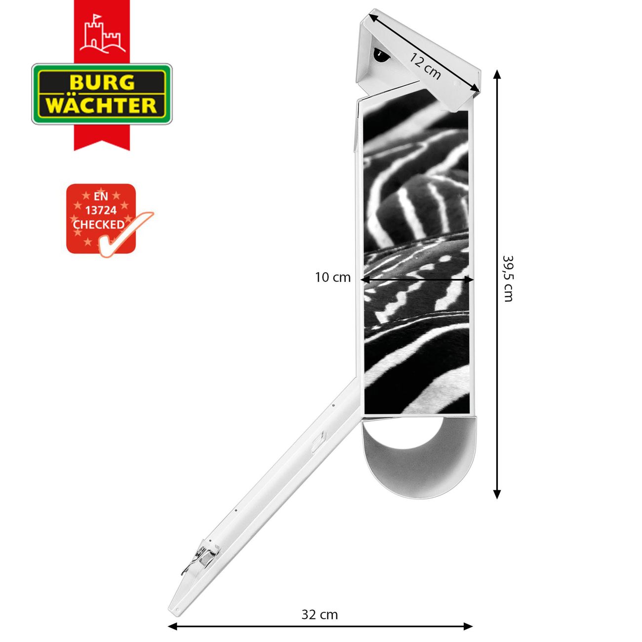 Der BURG-WÄCHTER Stahl Briefkasten mit Zebras Motiv bietet Ihnen mit seinem Fassungsvermögen genügend Platz auch für große A4 Sendungen und Zeitschriften. Das integrierte Regendach schützt Ihre Post vor dem Eindringen von Regen.