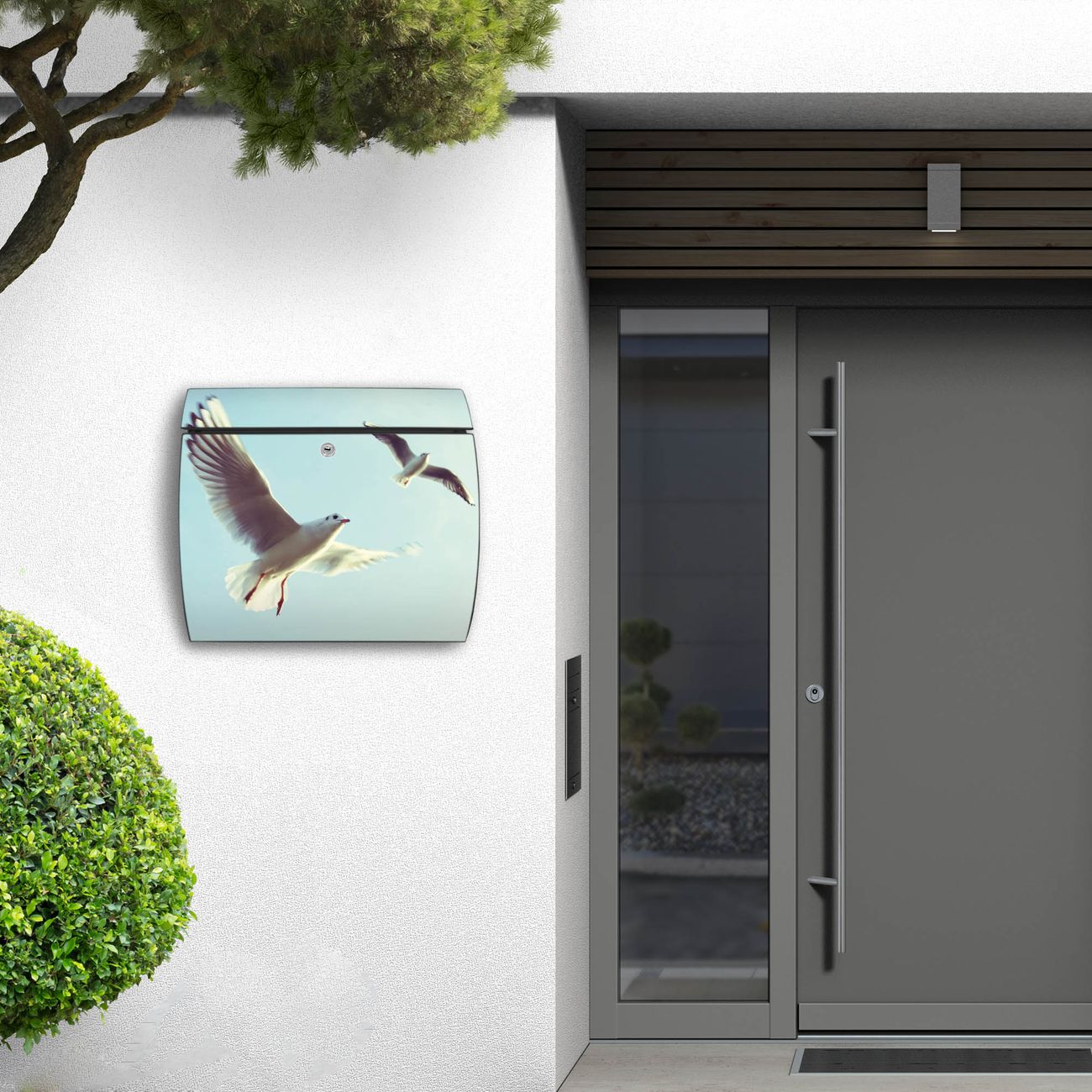 Der geschwungene Burg Wächter Briefkasten Toscana mit Motiv 2 Möwen bietet Ihnen mit seinem großen Fassungsvermögen genügend Platz auch für große A4 Sendungen. Auf Wunsch können Sie bei uns den passenden Standfuß bestellen und so aus dem Wandbriefkasten einen Standbriefkasten machen. Der integrierte Öffnungsstopp ermöglicht eine einfache Handhabung beim Entnehmen der Post.