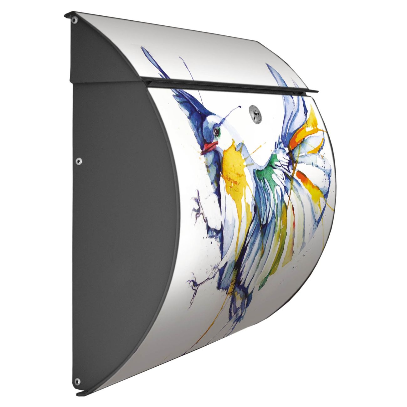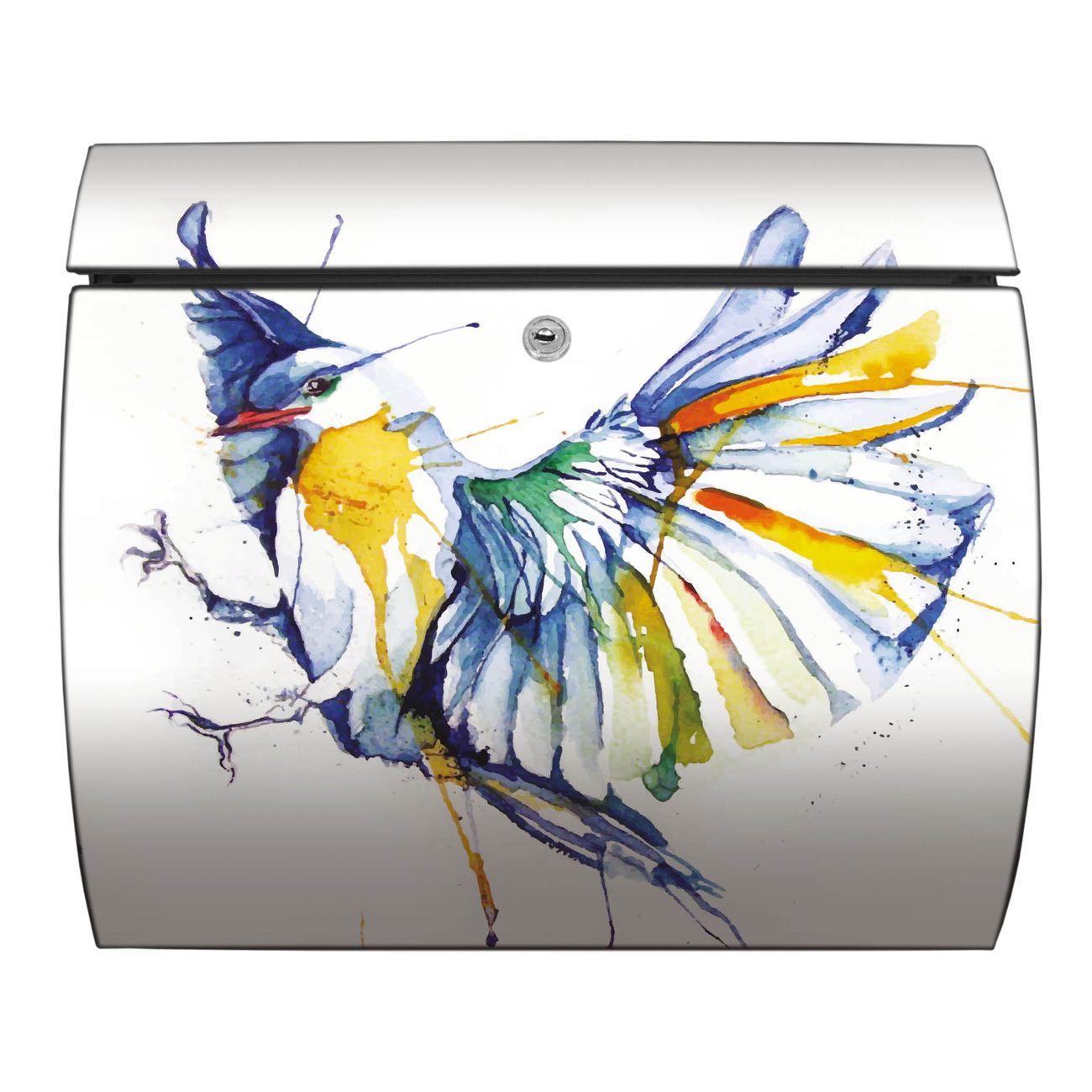 Der geschwungene Burg Wächter Briefkasten Toscana mit Motiv Aquarell Vogel bietet Ihnen mit seinem großen Fassungsvermögen genügend Platz auch für große A4 Sendungen. Auf Wunsch können Sie bei uns den passenden Standfuß bestellen und so aus dem Wandbriefkasten einen Standbriefkasten machen. Der integrierte Öffnungsstopp ermöglicht eine einfache Handhabung beim Entnehmen der Post.