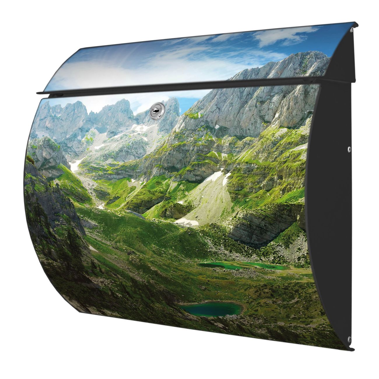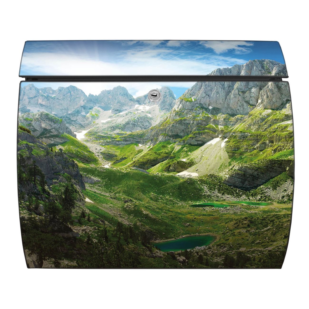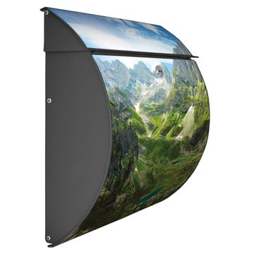 Der geschwungene Burg Wächter Briefkasten Toscana mit Motiv Bergsee Alpen bietet Ihnen mit seinem großen Fassungsvermögen genügend Platz auch für große A4 Sendungen. Auf Wunsch können Sie bei uns den passenden Standfuß bestellen und so aus dem Wandbriefkasten einen Standbriefkasten machen. Der integrierte Öffnungsstopp ermöglicht eine einfache Handhabung beim Entnehmen der Post.
