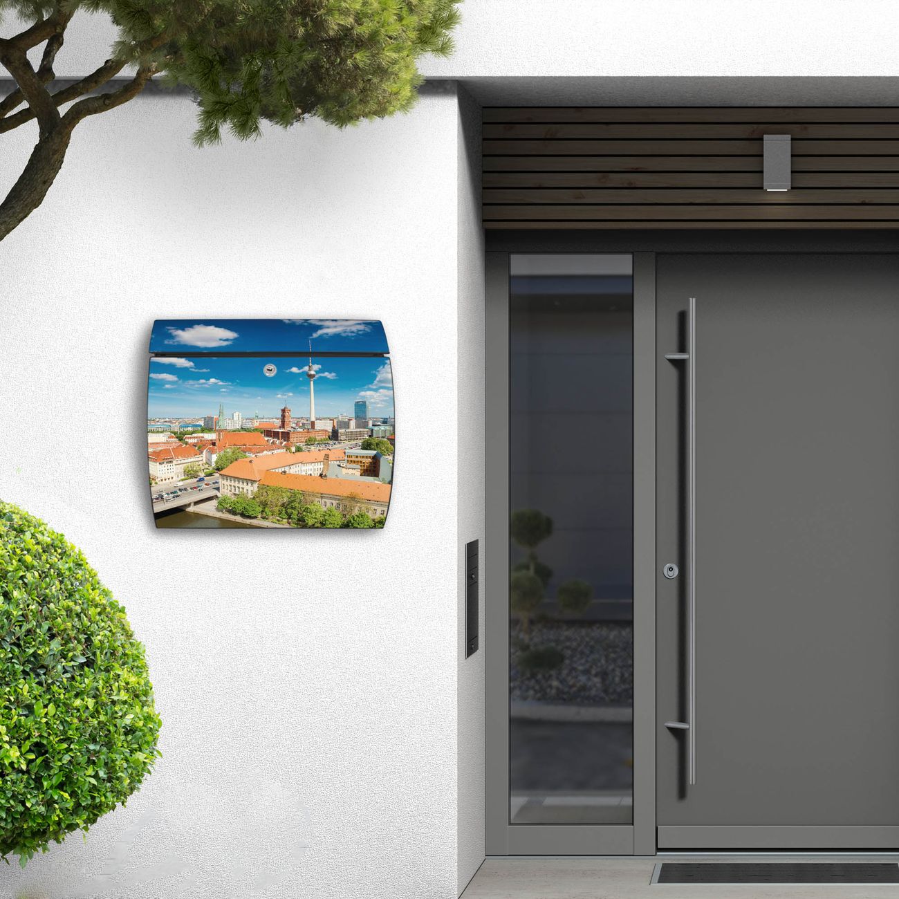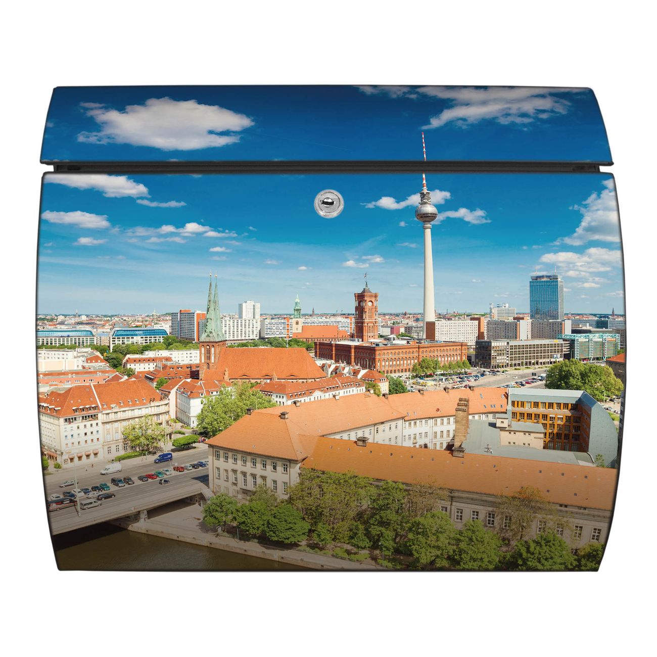 FUNKTION: DESIGN: Das Burg Wächter Modell Toscana mit Motiv Berlin Mitte hat ein sehr ansprechendes und zeitloses Design und ist besonderes wetterfest. Heben Sie Sich von der tristen grauen Masse ab, ohne auf Funktionalität zu verzichten. Wir bieten Ihnen ebenfalls Namensschilder, bereits beschriftet oder frei zu beschriften, und verschiedene selbst gestaltete Bitte-Keine-Werbung-Aufkleber. DETAILS: Der Postkasten besteht aus vollflächig verzinktem Stahl welcher in Anthrazit oder Weiß lackiert wurde oder aus Edelstahl (je nach gewählter Variante). Das Motiv besteht aus einer wetter- und UV-festen Folie, die mit einem Schutzlaminat überzogen ist, durch die Ihren Briefkasten zusätzlich vor Kratzern geschützt ist und auf den Briefkasten kaschiert wurde. Sie erhalten zu Ihrem neuen Design Briefkasten 2 Schlüssel sowie das passende Montagematerial. BANJADO: Ihr Briefkasten wird von Burg Wächter in Deutschland gefertigt und in unserer kleinen Manufaktur von Hand veredelt. Die Motivfolie ist lösungsmittelfrei und schutzlaminiert, dies sorgt für einen langen Halt. Wir legen großen Wert auf die Verbindung von Funktionalität und Design. Sie erhalten besondere Handarbeit aus Sachsen und Made in Germany.