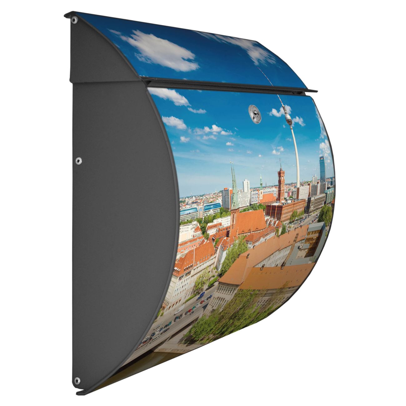 Der geschwungene Burg Wächter Briefkasten Toscana mit Motiv Berlin Mitte bietet Ihnen mit seinem großen Fassungsvermögen genügend Platz auch für große A4 Sendungen. Auf Wunsch können Sie bei uns den passenden Standfuß bestellen und so aus dem Wandbriefkasten einen Standbriefkasten machen. Der integrierte Öffnungsstopp ermöglicht eine einfache Handhabung beim Entnehmen der Post.