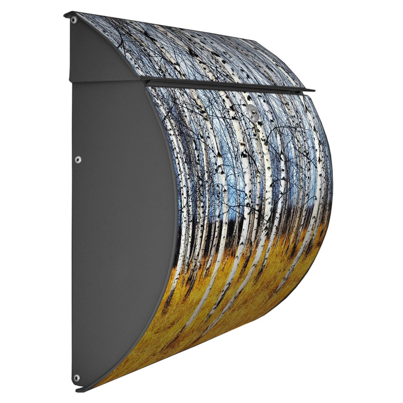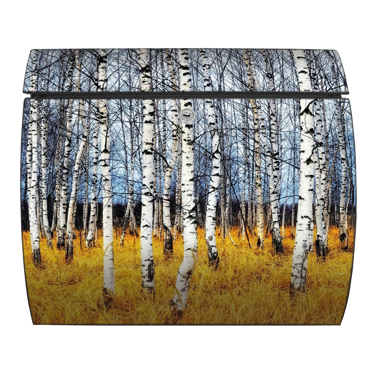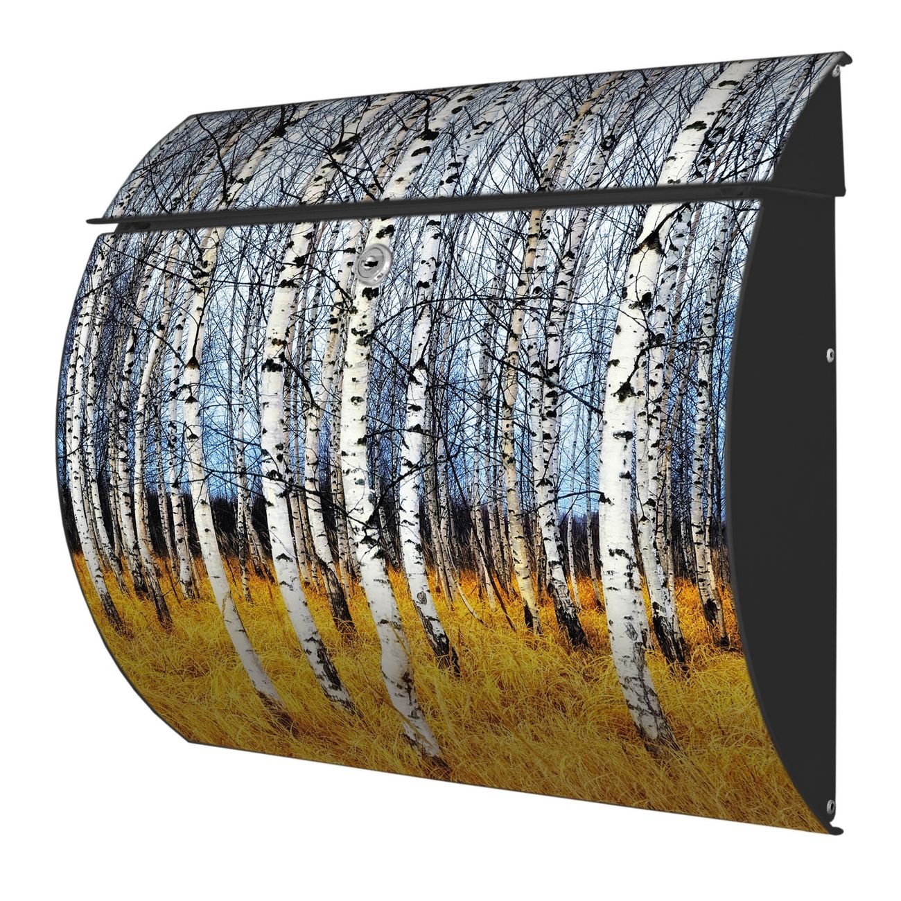 FUNKTION: DESIGN: Das Burg Wächter Modell Toscana mit Motiv Birkenhain hat ein sehr ansprechendes und zeitloses Design und ist besonderes wetterfest. Heben Sie Sich von der tristen grauen Masse ab, ohne auf Funktionalität zu verzichten. Wir bieten Ihnen ebenfalls Namensschilder, bereits beschriftet oder frei zu beschriften, und verschiedene selbst gestaltete Bitte-Keine-Werbung-Aufkleber. DETAILS: Der Postkasten besteht aus vollflächig verzinktem Stahl welcher in Anthrazit oder Weiß lackiert wurde oder aus Edelstahl (je nach gewählter Variante). Das Motiv besteht aus einer wetter- und UV-festen Folie, die mit einem Schutzlaminat überzogen ist, durch die Ihren Briefkasten zusätzlich vor Kratzern geschützt ist und auf den Briefkasten kaschiert wurde. Sie erhalten zu Ihrem neuen Design Briefkasten 2 Schlüssel sowie das passende Montagematerial. BANJADO: Ihr Briefkasten wird von Burg Wächter in Deutschland gefertigt und in unserer kleinen Manufaktur von Hand veredelt. Die Motivfolie ist lösungsmittelfrei und schutzlaminiert, dies sorgt für einen langen Halt. Wir legen großen Wert auf die Verbindung von Funktionalität und Design. Sie erhalten besondere Handarbeit aus Sachsen und Made in Germany.