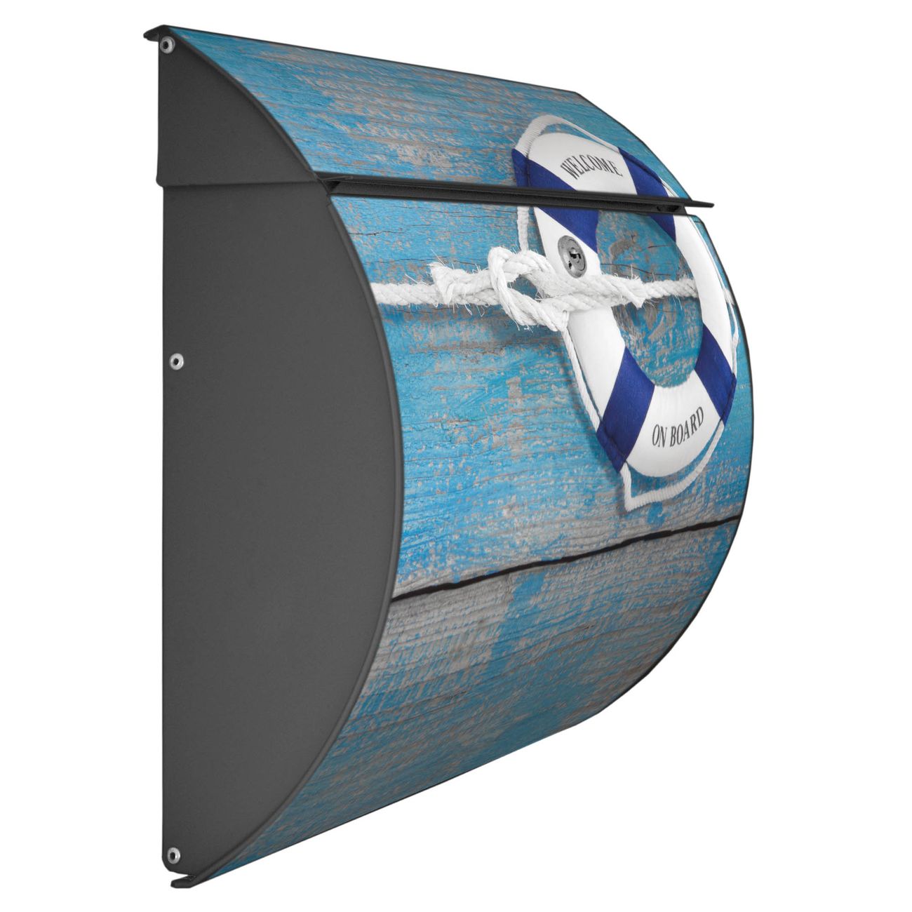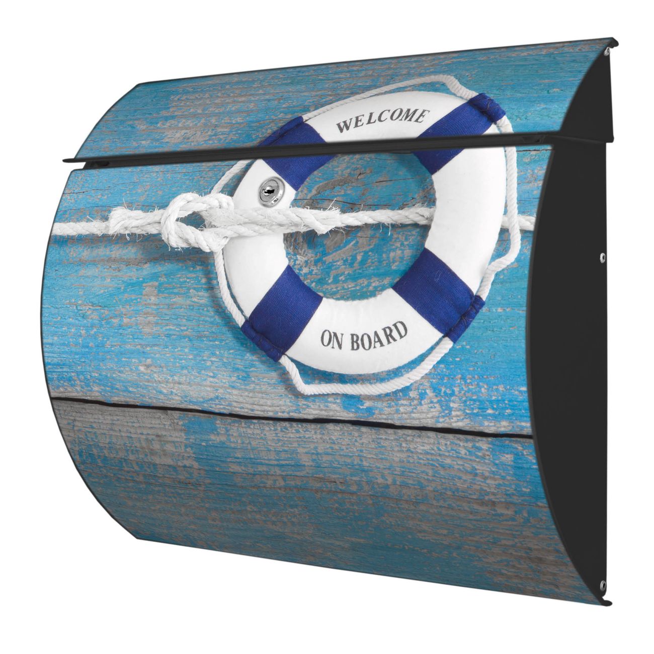 Der geschwungene Burg Wächter Briefkasten Toscana mit Motiv Blauer Rettungsring bietet Ihnen mit seinem großen Fassungsvermögen genügend Platz auch für große A4 Sendungen. Auf Wunsch können Sie bei uns den passenden Standfuß bestellen und so aus dem Wandbriefkasten einen Standbriefkasten machen. Der integrierte Öffnungsstopp ermöglicht eine einfache Handhabung beim Entnehmen der Post.