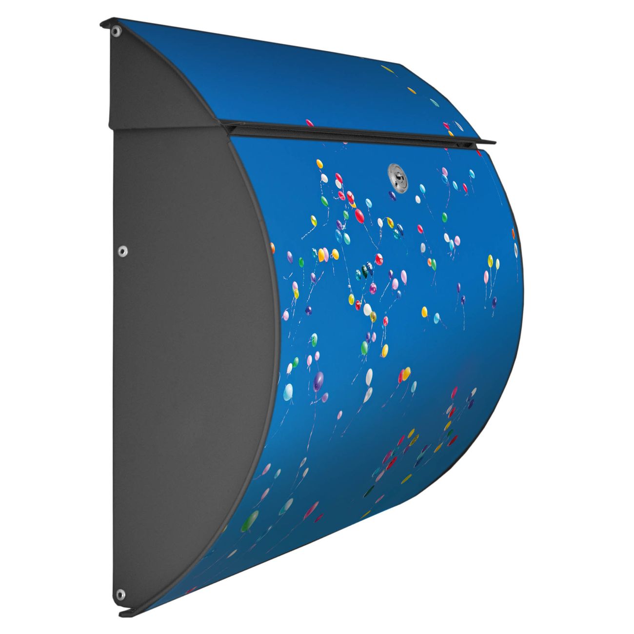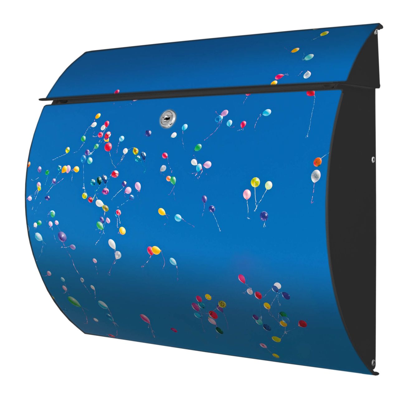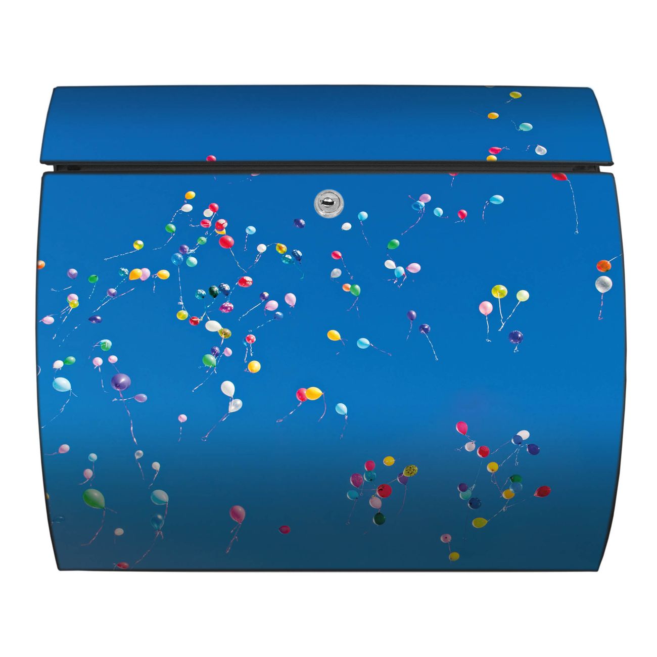 Der geschwungene Burg Wächter Briefkasten Toscana mit Motiv Bunte Luftballons bietet Ihnen mit seinem großen Fassungsvermögen genügend Platz auch für große A4 Sendungen. Auf Wunsch können Sie bei uns den passenden Standfuß bestellen und so aus dem Wandbriefkasten einen Standbriefkasten machen. Der integrierte Öffnungsstopp ermöglicht eine einfache Handhabung beim Entnehmen der Post.
