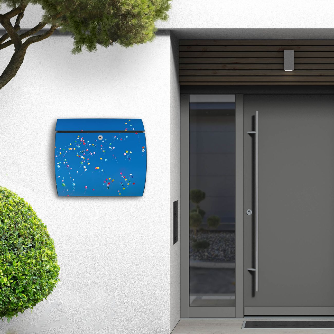FUNKTION: DESIGN: Das Burg Wächter Modell Toscana mit Motiv Bunte Luftballons hat ein sehr ansprechendes und zeitloses Design und ist besonderes wetterfest. Heben Sie Sich von der tristen grauen Masse ab, ohne auf Funktionalität zu verzichten. Wir bieten Ihnen ebenfalls Namensschilder, bereits beschriftet oder frei zu beschriften, und verschiedene selbst gestaltete Bitte-Keine-Werbung-Aufkleber. DETAILS: Der Postkasten besteht aus vollflächig verzinktem Stahl welcher in Anthrazit oder Weiß lackiert wurde oder aus Edelstahl (je nach gewählter Variante). Das Motiv besteht aus einer wetter- und UV-festen Folie, die mit einem Schutzlaminat überzogen ist, durch die Ihren Briefkasten zusätzlich vor Kratzern geschützt ist und auf den Briefkasten kaschiert wurde. Sie erhalten zu Ihrem neuen Design Briefkasten 2 Schlüssel sowie das passende Montagematerial. BANJADO: Ihr Briefkasten wird von Burg Wächter in Deutschland gefertigt und in unserer kleinen Manufaktur von Hand veredelt. Die Motivfolie ist lösungsmittelfrei und schutzlaminiert, dies sorgt für einen langen Halt. Wir legen großen Wert auf die Verbindung von Funktionalität und Design. Sie erhalten besondere Handarbeit aus Sachsen und Made in Germany.