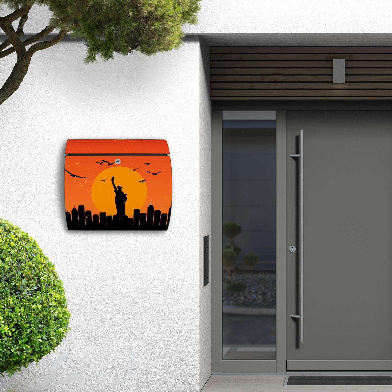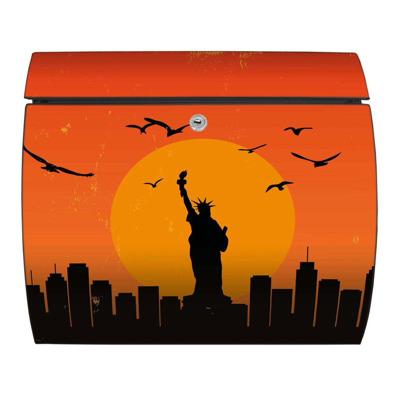 FUNKTION: DESIGN: Das Burg Wächter Modell Toscana mit Motiv City Poster New York hat ein sehr ansprechendes und zeitloses Design und ist besonderes wetterfest. Heben Sie Sich von der tristen grauen Masse ab, ohne auf Funktionalität zu verzichten. Wir bieten Ihnen ebenfalls Namensschilder, bereits beschriftet oder frei zu beschriften, und verschiedene selbst gestaltete Bitte-Keine-Werbung-Aufkleber. DETAILS: Der Postkasten besteht aus vollflächig verzinktem Stahl welcher in Anthrazit oder Weiß lackiert wurde oder aus Edelstahl (je nach gewählter Variante). Das Motiv besteht aus einer wetter- und UV-festen Folie, die mit einem Schutzlaminat überzogen ist, durch die Ihren Briefkasten zusätzlich vor Kratzern geschützt ist und auf den Briefkasten kaschiert wurde. Sie erhalten zu Ihrem neuen Design Briefkasten 2 Schlüssel sowie das passende Montagematerial. BANJADO: Ihr Briefkasten wird von Burg Wächter in Deutschland gefertigt und in unserer kleinen Manufaktur von Hand veredelt. Die Motivfolie ist lösungsmittelfrei und schutzlaminiert, dies sorgt für einen langen Halt. Wir legen großen Wert auf die Verbindung von Funktionalität und Design. Sie erhalten besondere Handarbeit aus Sachsen und Made in Germany.