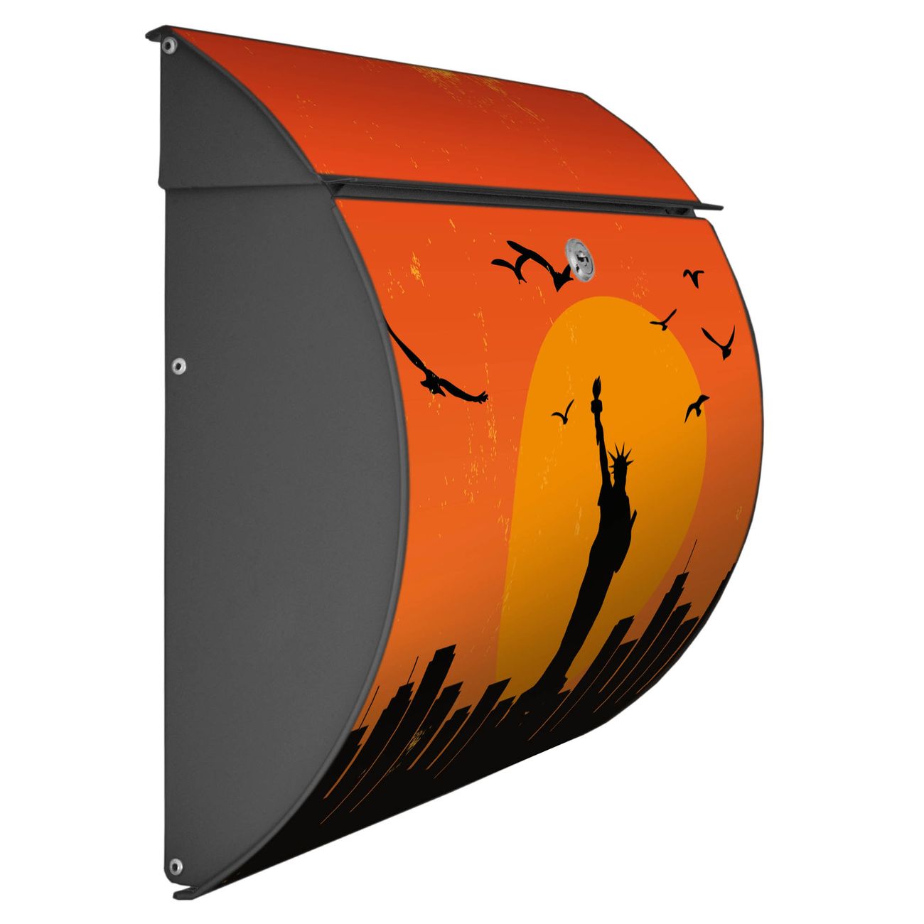Der geschwungene Burg Wächter Briefkasten Toscana mit Motiv City Poster New York bietet Ihnen mit seinem großen Fassungsvermögen genügend Platz auch für große A4 Sendungen. Auf Wunsch können Sie bei uns den passenden Standfuß bestellen und so aus dem Wandbriefkasten einen Standbriefkasten machen. Der integrierte Öffnungsstopp ermöglicht eine einfache Handhabung beim Entnehmen der Post.
