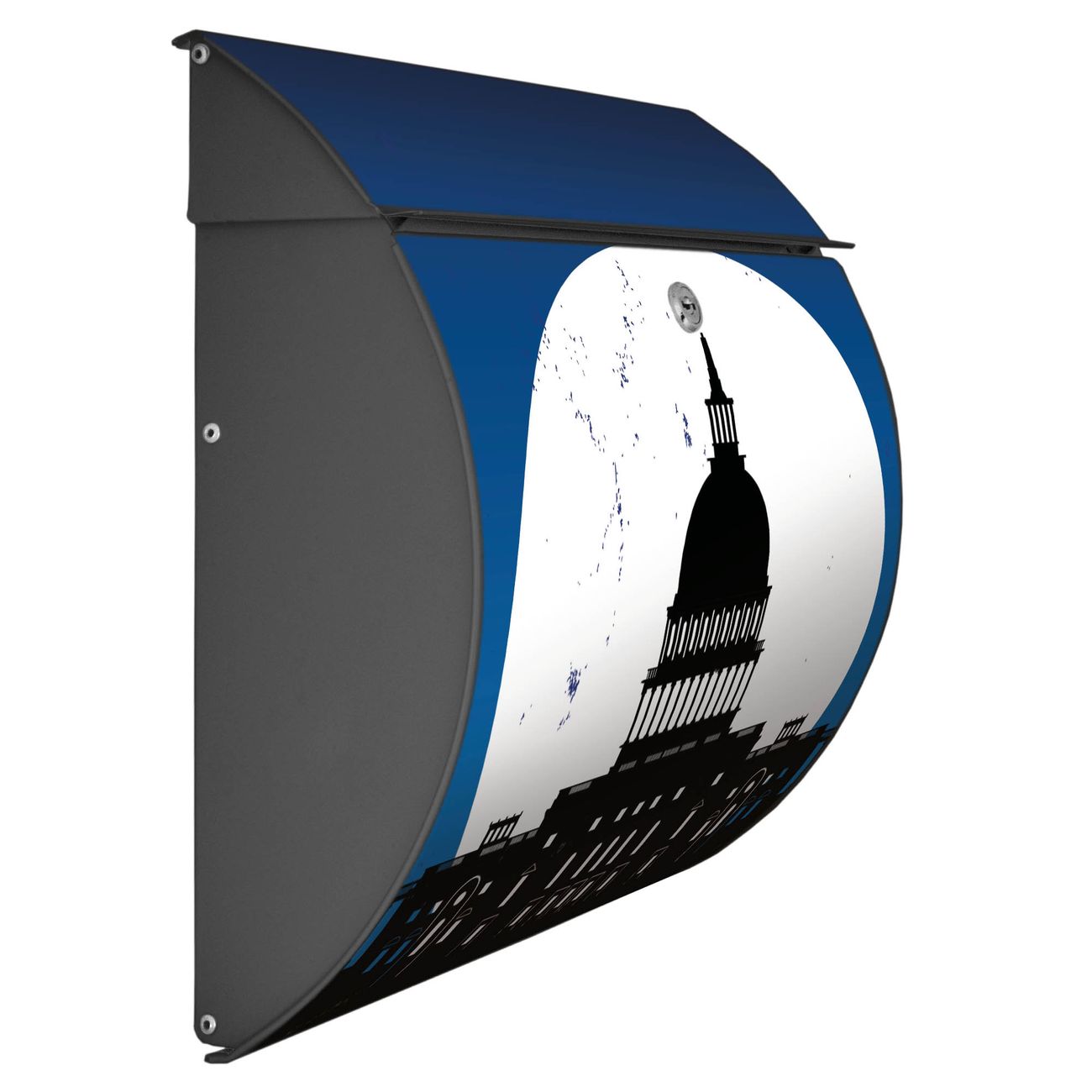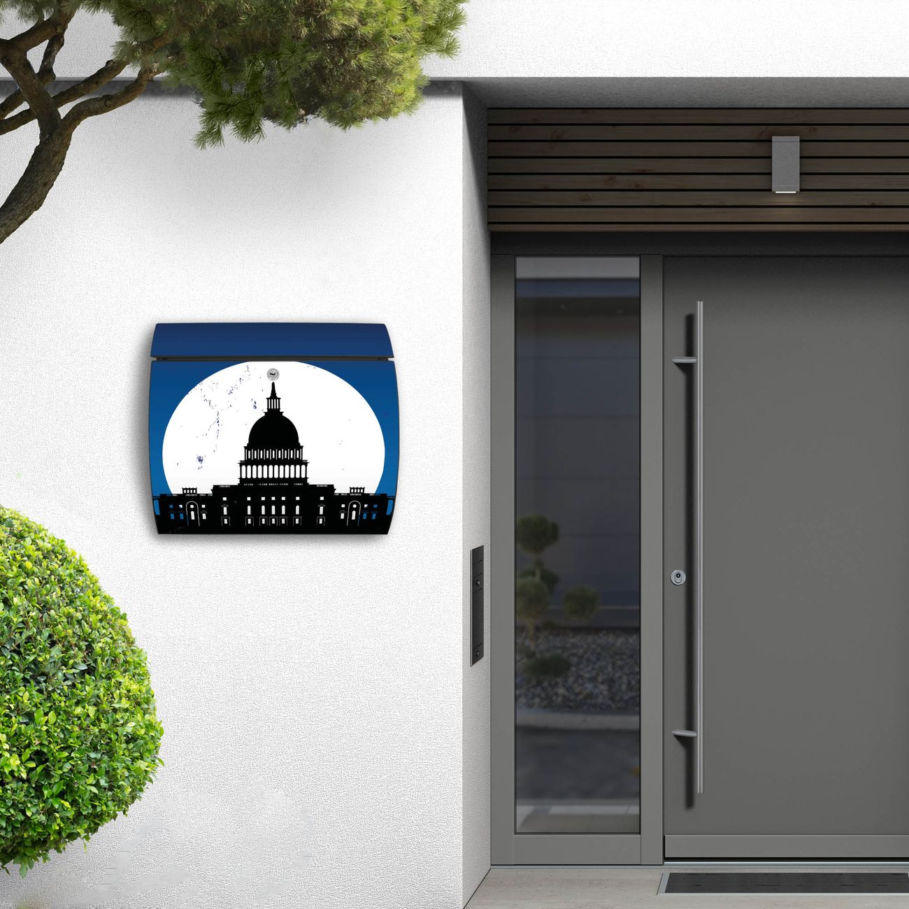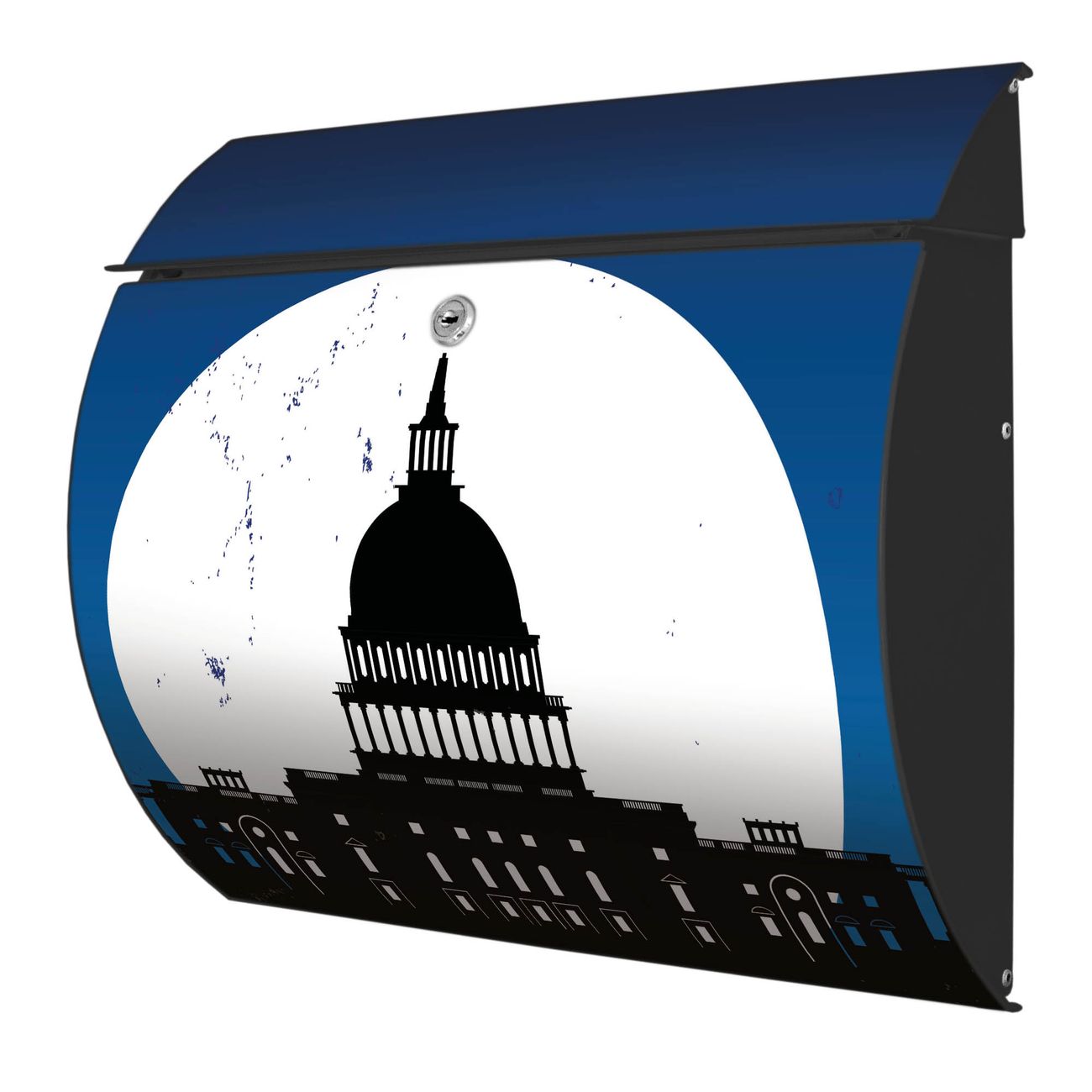 Der geschwungene Burg Wächter Briefkasten Toscana mit Motiv City Poster Washington bietet Ihnen mit seinem großen Fassungsvermögen genügend Platz auch für große A4 Sendungen. Auf Wunsch können Sie bei uns den passenden Standfuß bestellen und so aus dem Wandbriefkasten einen Standbriefkasten machen. Der integrierte Öffnungsstopp ermöglicht eine einfache Handhabung beim Entnehmen der Post.