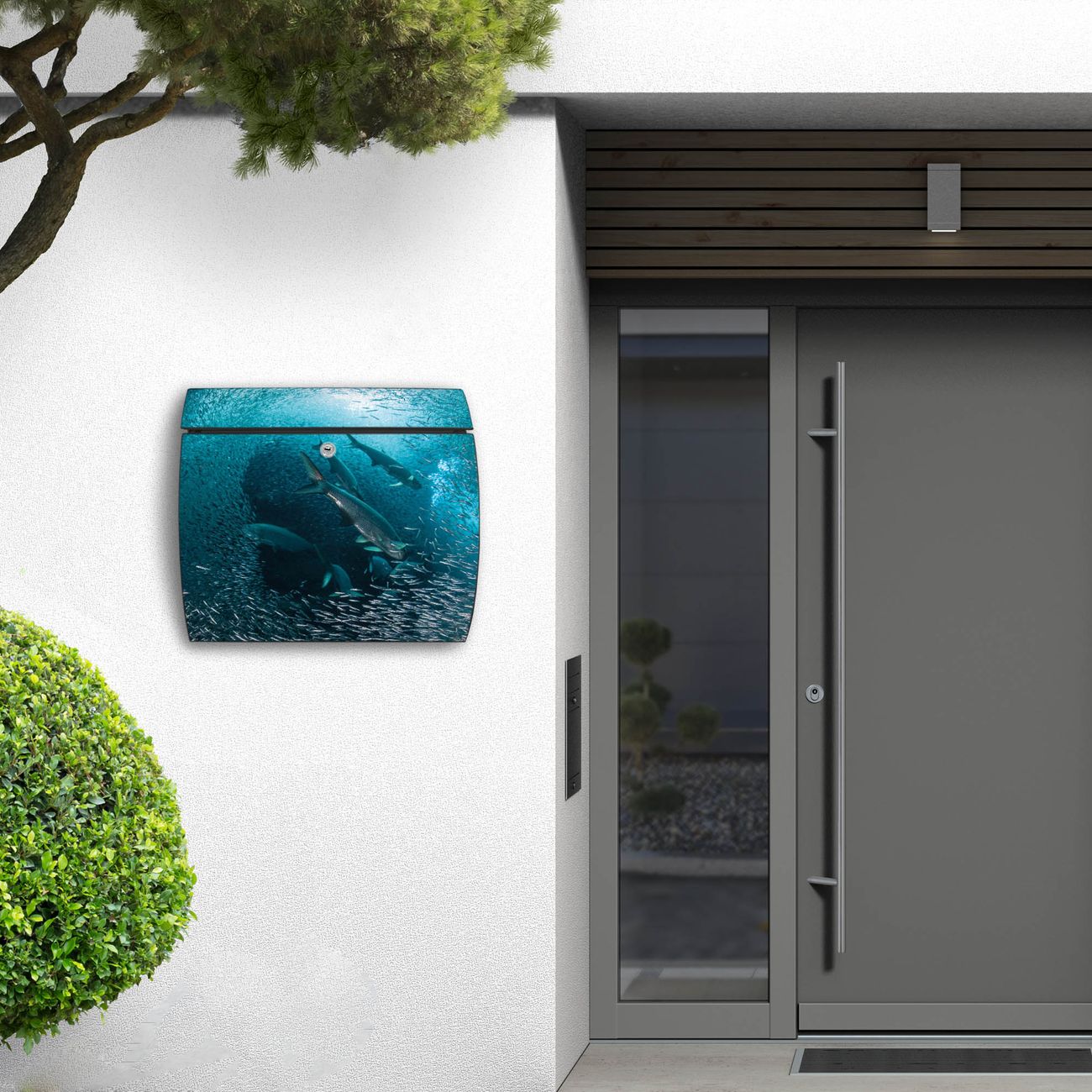 Der geschwungene Burg Wächter Briefkasten Toscana mit Motiv Fische im Meer bietet Ihnen mit seinem großen Fassungsvermögen genügend Platz auch für große A4 Sendungen. Auf Wunsch können Sie bei uns den passenden Standfuß bestellen und so aus dem Wandbriefkasten einen Standbriefkasten machen. Der integrierte Öffnungsstopp ermöglicht eine einfache Handhabung beim Entnehmen der Post.