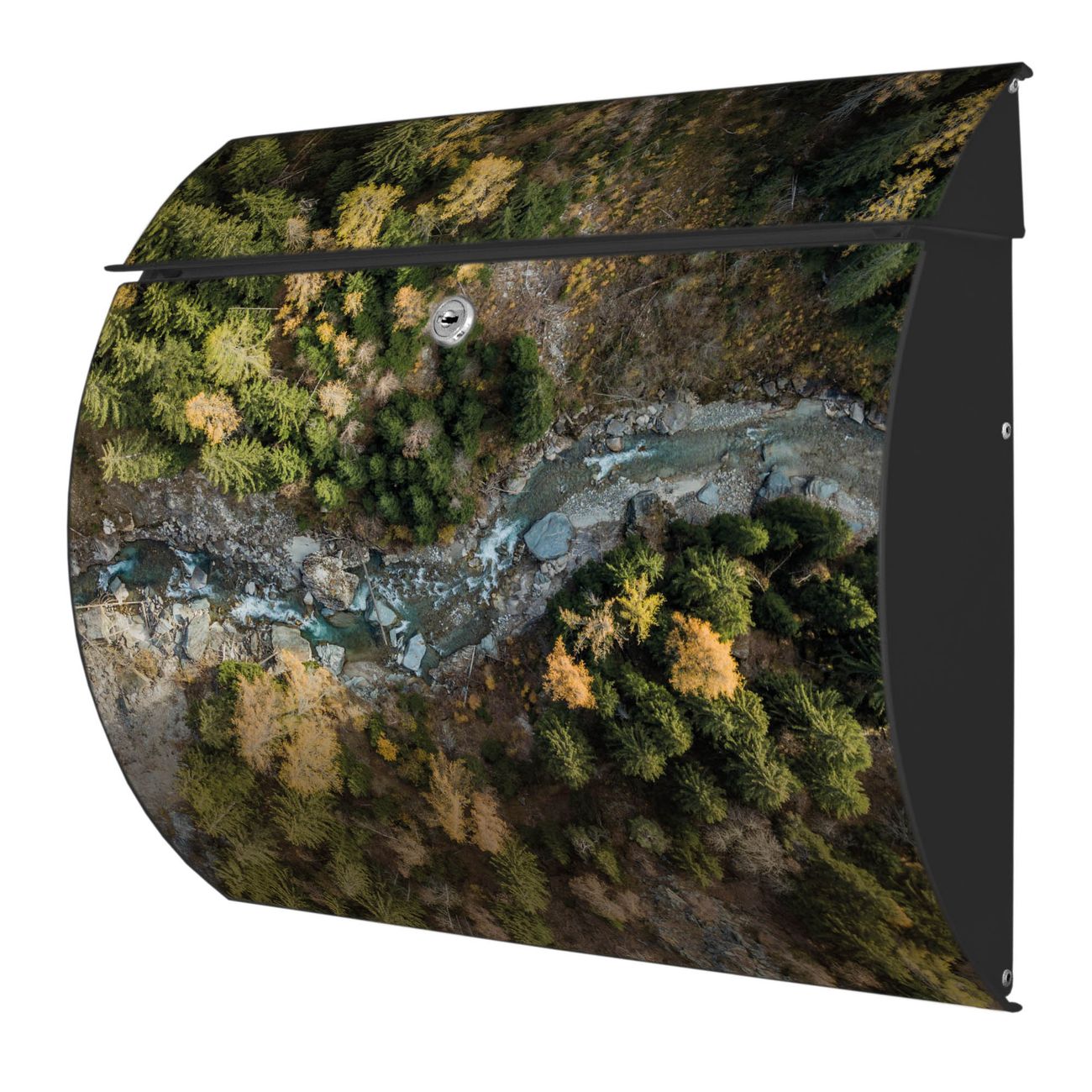 Der geschwungene Burg Wächter Briefkasten Toscana mit Motiv Fluss im Tal 2 bietet Ihnen mit seinem großen Fassungsvermögen genügend Platz auch für große A4 Sendungen. Auf Wunsch können Sie bei uns den passenden Standfuß bestellen und so aus dem Wandbriefkasten einen Standbriefkasten machen. Der integrierte Öffnungsstopp ermöglicht eine einfache Handhabung beim Entnehmen der Post.