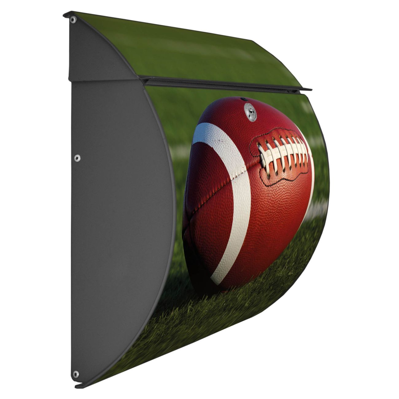 Der geschwungene Burg Wächter Briefkasten Toscana mit Motiv Football bietet Ihnen mit seinem großen Fassungsvermögen genügend Platz auch für große A4 Sendungen. Auf Wunsch können Sie bei uns den passenden Standfuß bestellen und so aus dem Wandbriefkasten einen Standbriefkasten machen. Der integrierte Öffnungsstopp ermöglicht eine einfache Handhabung beim Entnehmen der Post.
