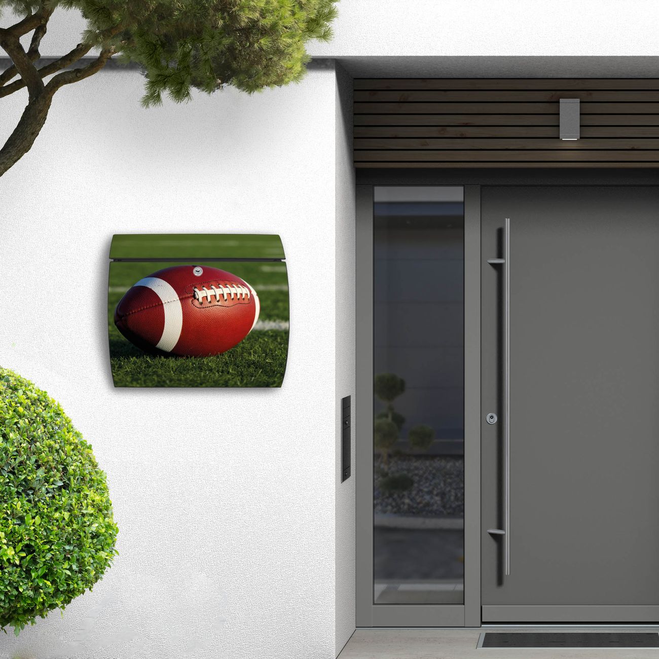 FUNKTION: DESIGN: Das Burg Wächter Modell Toscana mit Motiv Football hat ein sehr ansprechendes und zeitloses Design und ist besonderes wetterfest. Heben Sie Sich von der tristen grauen Masse ab, ohne auf Funktionalität zu verzichten. Wir bieten Ihnen ebenfalls Namensschilder, bereits beschriftet oder frei zu beschriften, und verschiedene selbst gestaltete Bitte-Keine-Werbung-Aufkleber. DETAILS: Der Postkasten besteht aus vollflächig verzinktem Stahl welcher in Anthrazit oder Weiß lackiert wurde oder aus Edelstahl (je nach gewählter Variante). Das Motiv besteht aus einer wetter- und UV-festen Folie, die mit einem Schutzlaminat überzogen ist, durch die Ihren Briefkasten zusätzlich vor Kratzern geschützt ist und auf den Briefkasten kaschiert wurde. Sie erhalten zu Ihrem neuen Design Briefkasten 2 Schlüssel sowie das passende Montagematerial. BANJADO: Ihr Briefkasten wird von Burg Wächter in Deutschland gefertigt und in unserer kleinen Manufaktur von Hand veredelt. Die Motivfolie ist lösungsmittelfrei und schutzlaminiert, dies sorgt für einen langen Halt. Wir legen großen Wert auf die Verbindung von Funktionalität und Design. Sie erhalten besondere Handarbeit aus Sachsen und Made in Germany.