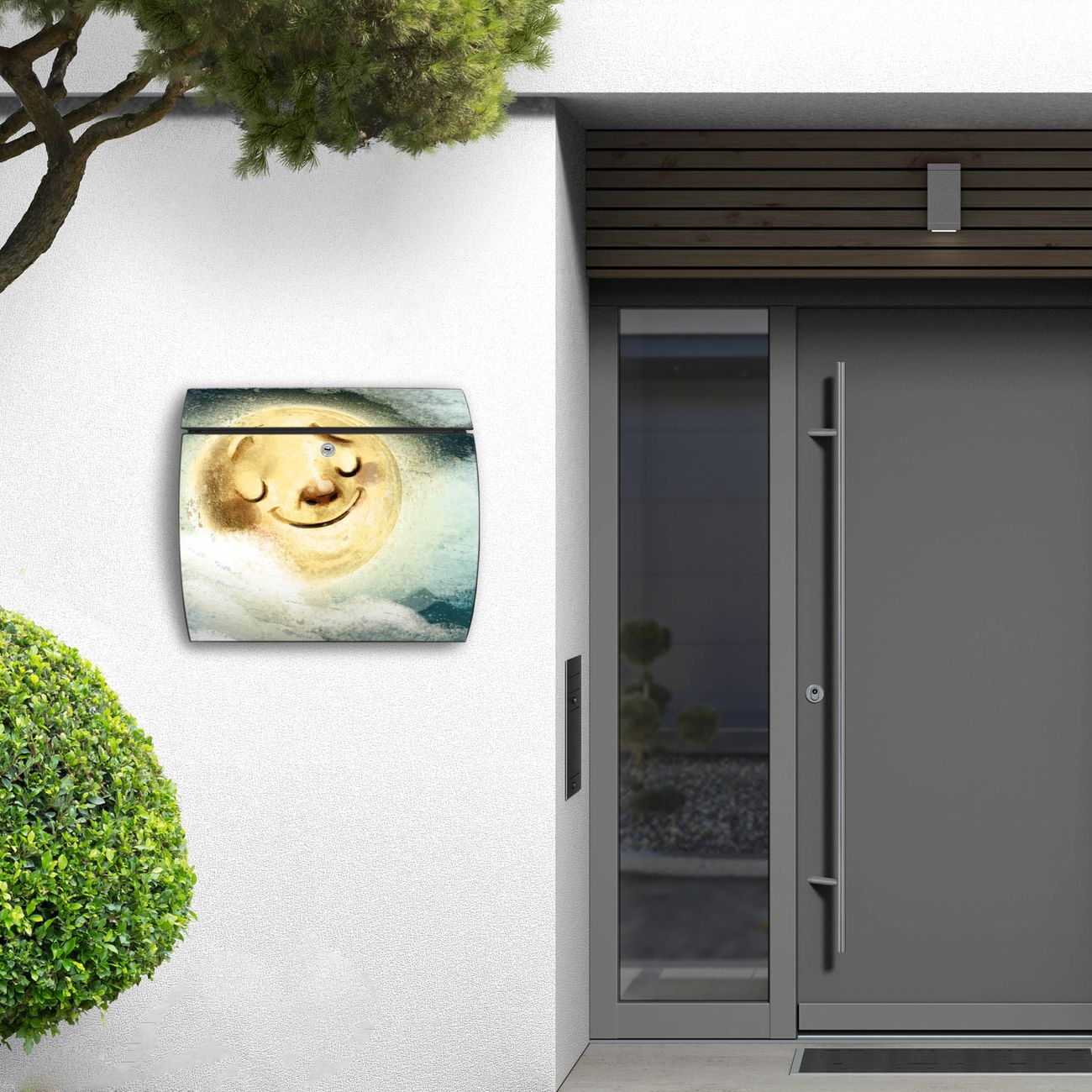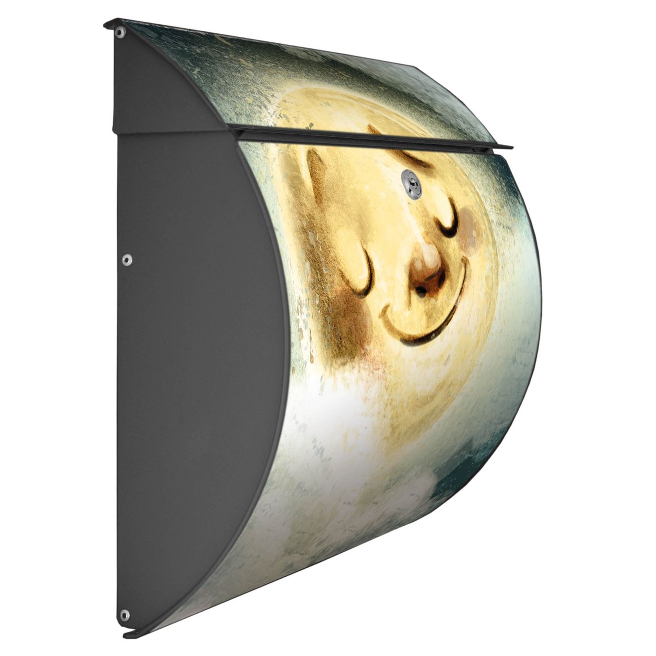 FUNKTION: DESIGN: Das Burg Wächter Modell Toscana mit Motiv Glücksmond hat ein sehr ansprechendes und zeitloses Design und ist besonderes wetterfest. Heben Sie Sich von der tristen grauen Masse ab, ohne auf Funktionalität zu verzichten. Wir bieten Ihnen ebenfalls Namensschilder, bereits beschriftet oder frei zu beschriften, und verschiedene selbst gestaltete Bitte-Keine-Werbung-Aufkleber. DETAILS: Der Postkasten besteht aus vollflächig verzinktem Stahl welcher in Anthrazit oder Weiß lackiert wurde oder aus Edelstahl (je nach gewählter Variante). Das Motiv besteht aus einer wetter- und UV-festen Folie, die mit einem Schutzlaminat überzogen ist, durch die Ihren Briefkasten zusätzlich vor Kratzern geschützt ist und auf den Briefkasten kaschiert wurde. Sie erhalten zu Ihrem neuen Design Briefkasten 2 Schlüssel sowie das passende Montagematerial. BANJADO: Ihr Briefkasten wird von Burg Wächter in Deutschland gefertigt und in unserer kleinen Manufaktur von Hand veredelt. Die Motivfolie ist lösungsmittelfrei und schutzlaminiert, dies sorgt für einen langen Halt. Wir legen großen Wert auf die Verbindung von Funktionalität und Design. Sie erhalten besondere Handarbeit aus Sachsen und Made in Germany.