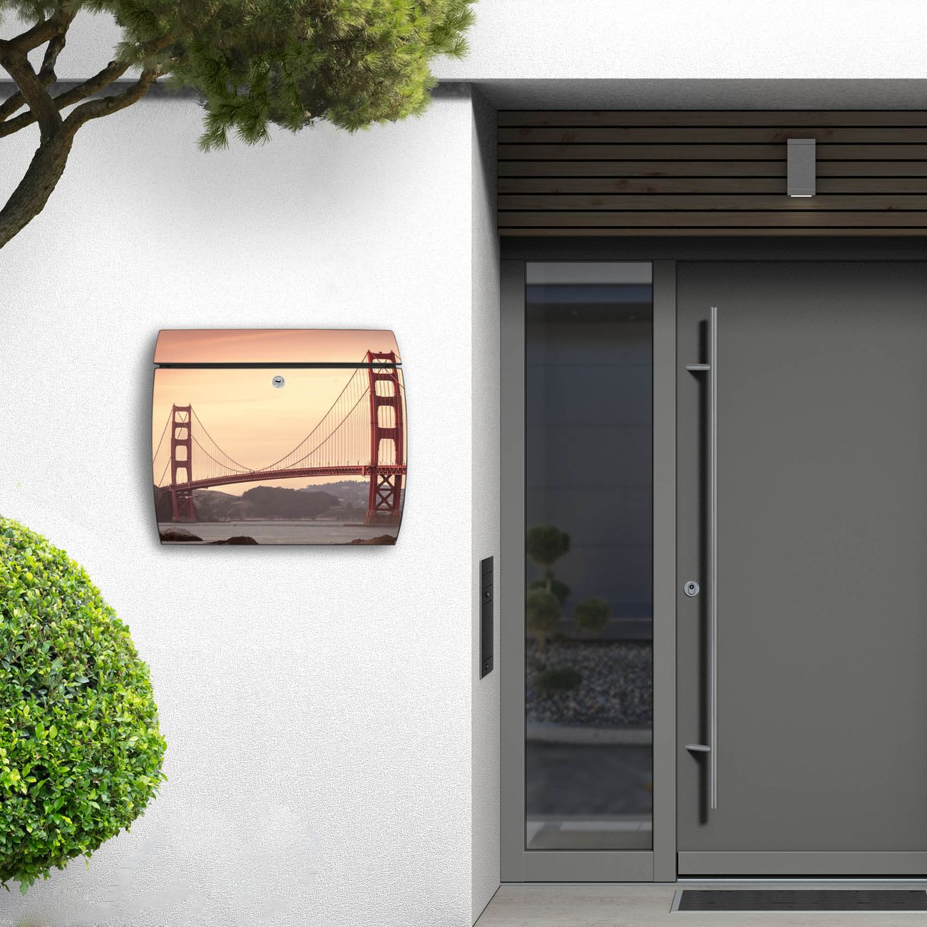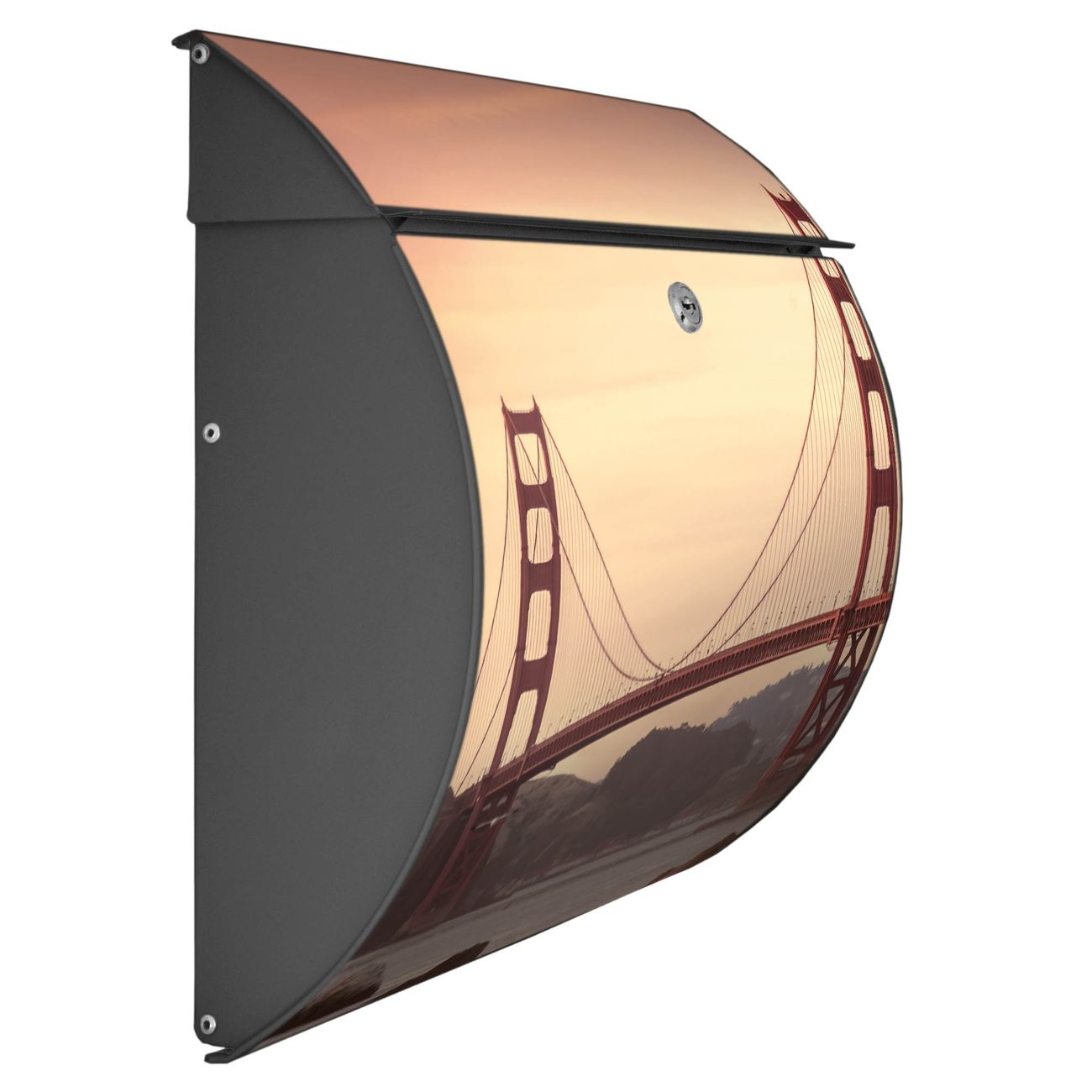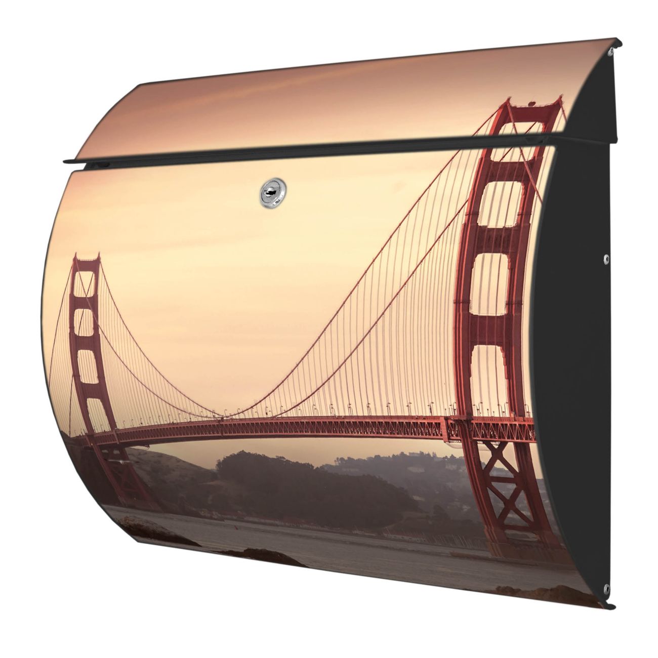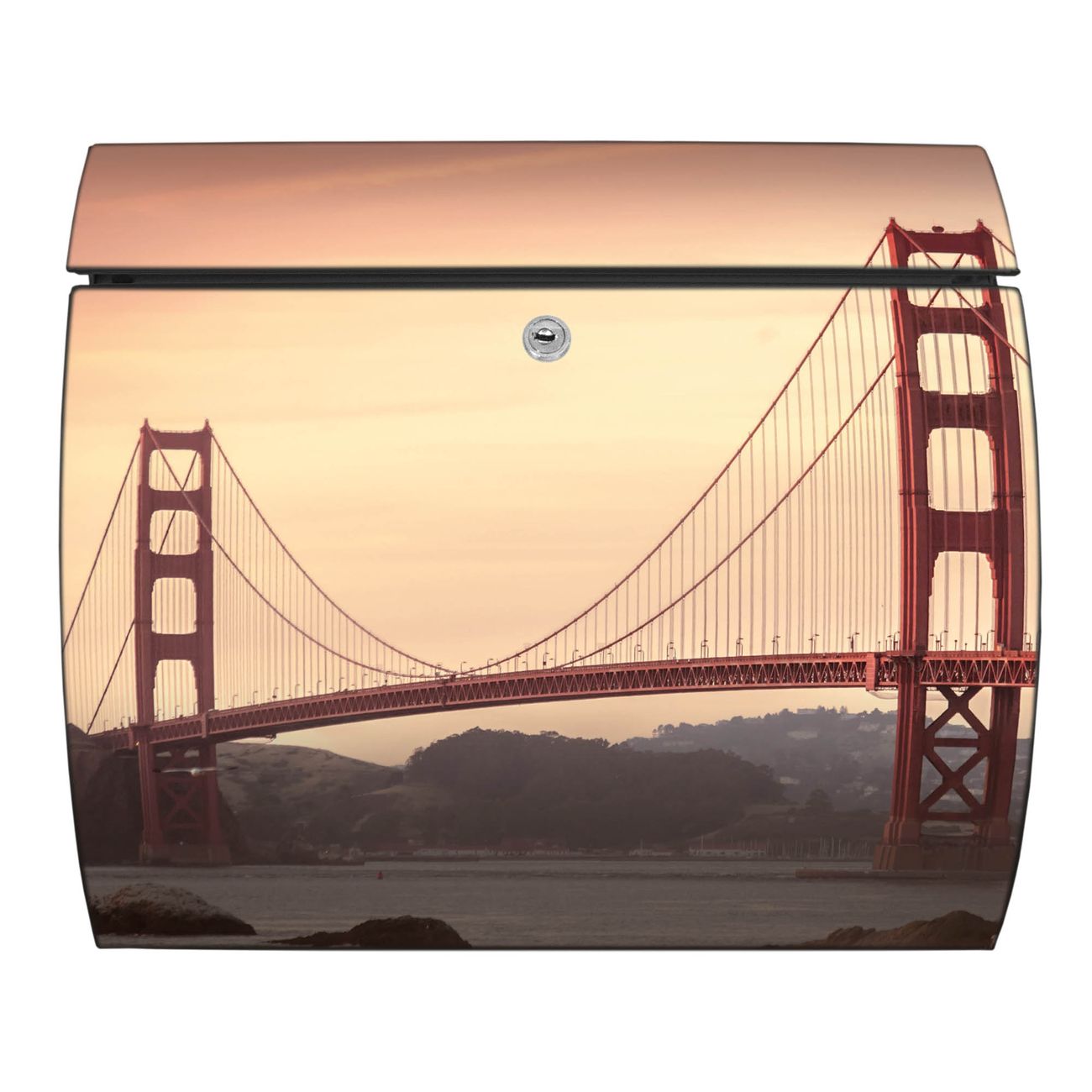 FUNKTION: DESIGN: Das Burg Wächter Modell Toscana mit Motiv Golden Gate Bridge 2 hat ein sehr ansprechendes und zeitloses Design und ist besonderes wetterfest. Heben Sie Sich von der tristen grauen Masse ab, ohne auf Funktionalität zu verzichten. Wir bieten Ihnen ebenfalls Namensschilder, bereits beschriftet oder frei zu beschriften, und verschiedene selbst gestaltete Bitte-Keine-Werbung-Aufkleber. DETAILS: Der Postkasten besteht aus vollflächig verzinktem Stahl welcher in Anthrazit oder Weiß lackiert wurde oder aus Edelstahl (je nach gewählter Variante). Das Motiv besteht aus einer wetter- und UV-festen Folie, die mit einem Schutzlaminat überzogen ist, durch die Ihren Briefkasten zusätzlich vor Kratzern geschützt ist und auf den Briefkasten kaschiert wurde. Sie erhalten zu Ihrem neuen Design Briefkasten 2 Schlüssel sowie das passende Montagematerial. BANJADO: Ihr Briefkasten wird von Burg Wächter in Deutschland gefertigt und in unserer kleinen Manufaktur von Hand veredelt. Die Motivfolie ist lösungsmittelfrei und schutzlaminiert, dies sorgt für einen langen Halt. Wir legen großen Wert auf die Verbindung von Funktionalität und Design. Sie erhalten besondere Handarbeit aus Sachsen und Made in Germany.