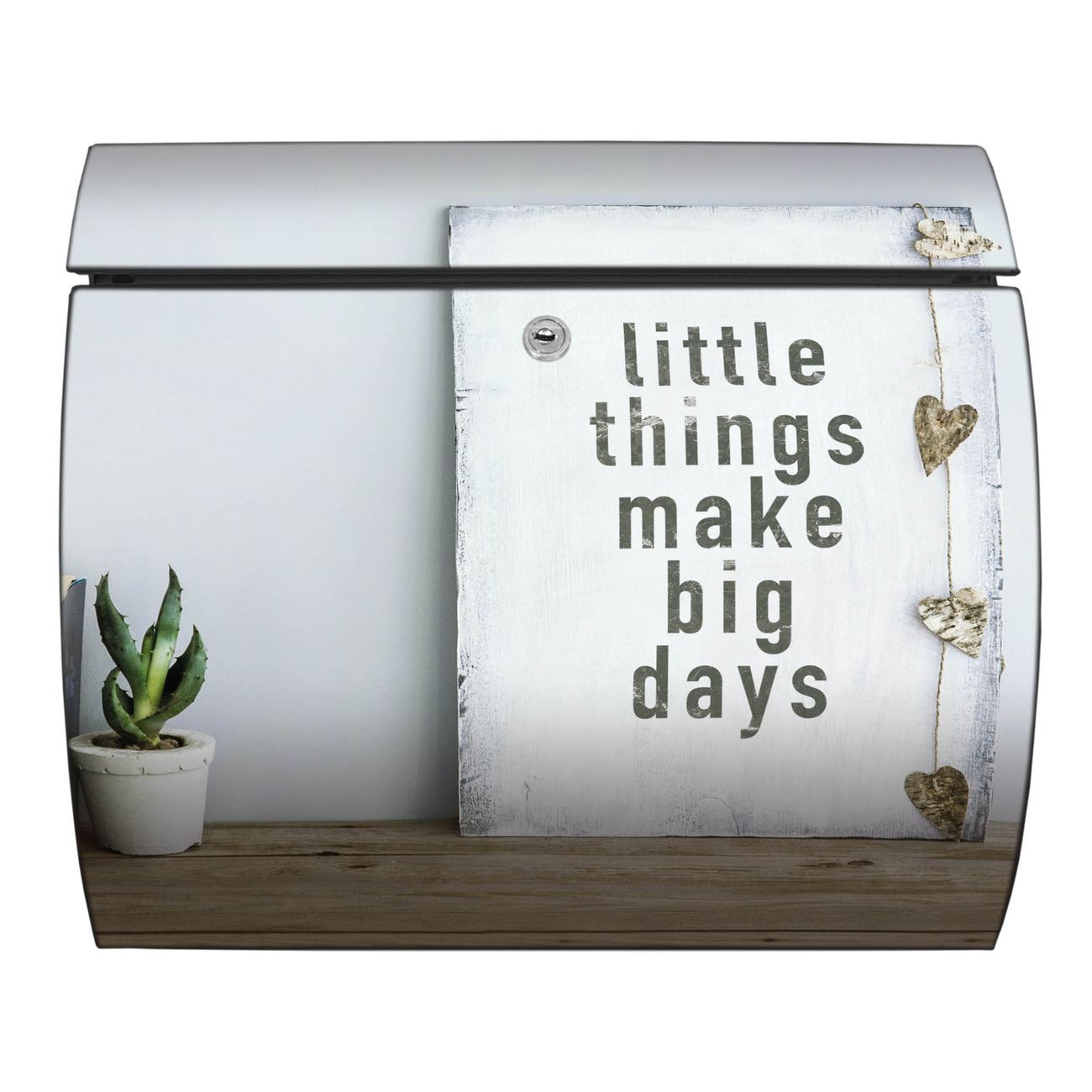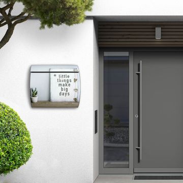 FUNKTION: DESIGN: Das Burg Wächter Modell Toscana mit Motiv Little Things hat ein sehr ansprechendes und zeitloses Design und ist besonderes wetterfest. Heben Sie Sich von der tristen grauen Masse ab, ohne auf Funktionalität zu verzichten. Wir bieten Ihnen ebenfalls Namensschilder, bereits beschriftet oder frei zu beschriften, und verschiedene selbst gestaltete Bitte-Keine-Werbung-Aufkleber. DETAILS: Der Postkasten besteht aus vollflächig verzinktem Stahl welcher in Anthrazit oder Weiß lackiert wurde oder aus Edelstahl (je nach gewählter Variante). Das Motiv besteht aus einer wetter- und UV-festen Folie, die mit einem Schutzlaminat überzogen ist, durch die Ihren Briefkasten zusätzlich vor Kratzern geschützt ist und auf den Briefkasten kaschiert wurde. Sie erhalten zu Ihrem neuen Design Briefkasten 2 Schlüssel sowie das passende Montagematerial. BANJADO: Ihr Briefkasten wird von Burg Wächter in Deutschland gefertigt und in unserer kleinen Manufaktur von Hand veredelt. Die Motivfolie ist lösungsmittelfrei und schutzlaminiert, dies sorgt für einen langen Halt. Wir legen großen Wert auf die Verbindung von Funktionalität und Design. Sie erhalten besondere Handarbeit aus Sachsen und Made in Germany.