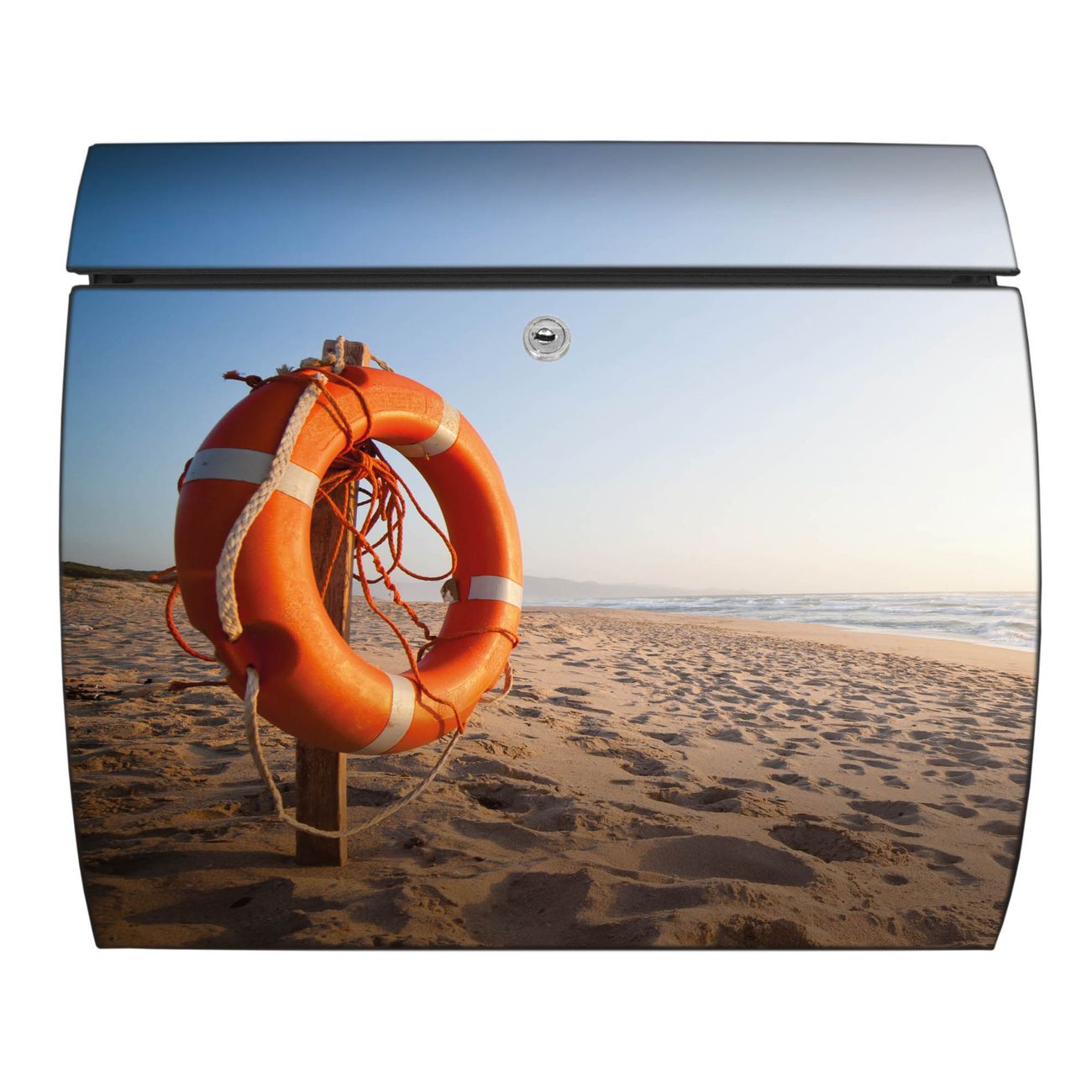 Der geschwungene Burg Wächter Briefkasten Toscana mit Motiv Morgens Am Strand bietet Ihnen mit seinem großen Fassungsvermögen genügend Platz auch für große A4 Sendungen. Auf Wunsch können Sie bei uns den passenden Standfuß bestellen und so aus dem Wandbriefkasten einen Standbriefkasten machen. Der integrierte Öffnungsstopp ermöglicht eine einfache Handhabung beim Entnehmen der Post.