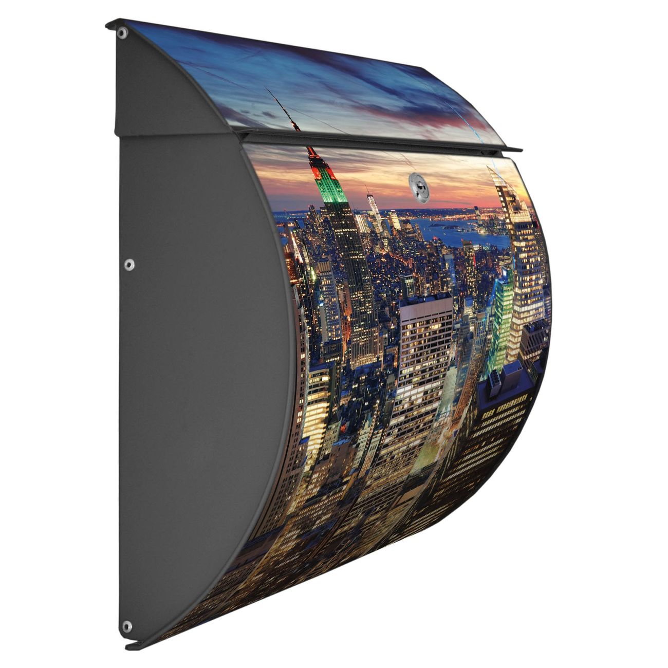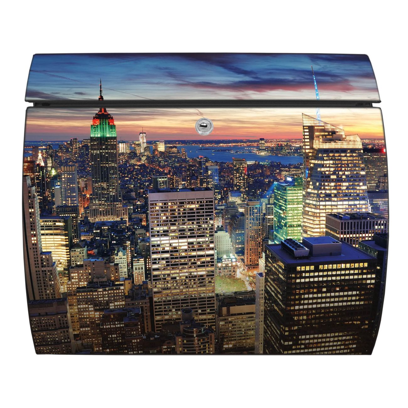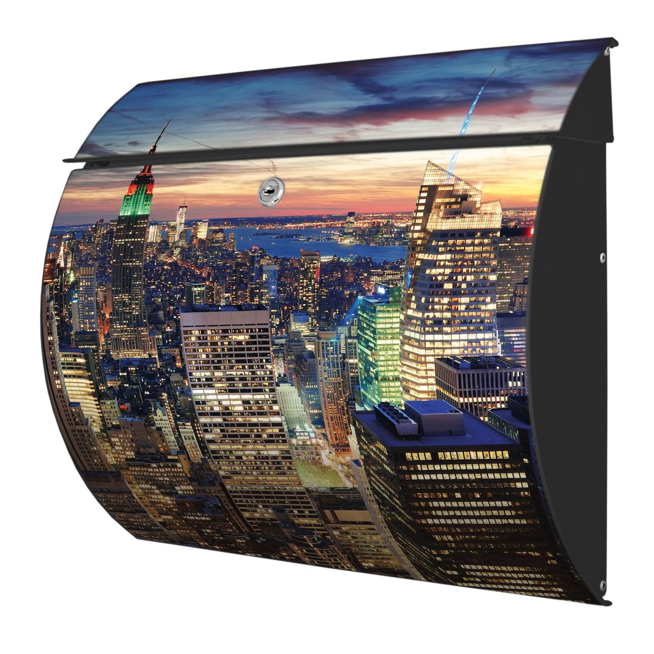 Der geschwungene Burg Wächter Briefkasten Toscana mit Motiv New York Sunset bietet Ihnen mit seinem großen Fassungsvermögen genügend Platz auch für große A4 Sendungen. Auf Wunsch können Sie bei uns den passenden Standfuß bestellen und so aus dem Wandbriefkasten einen Standbriefkasten machen. Der integrierte Öffnungsstopp ermöglicht eine einfache Handhabung beim Entnehmen der Post.