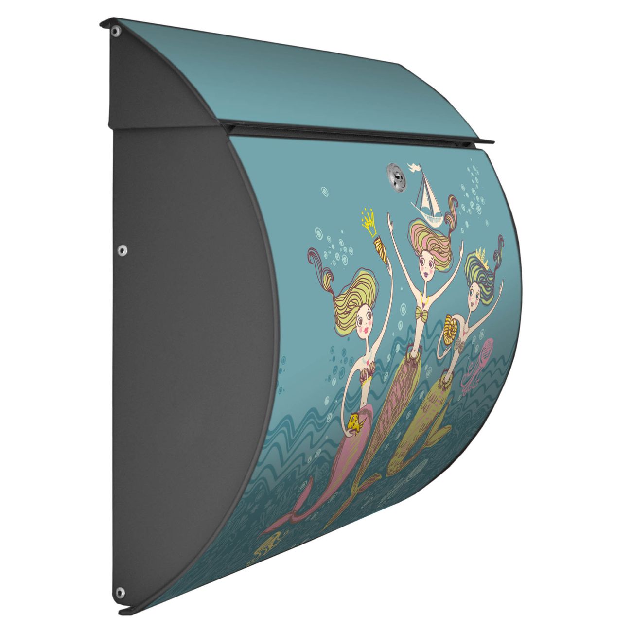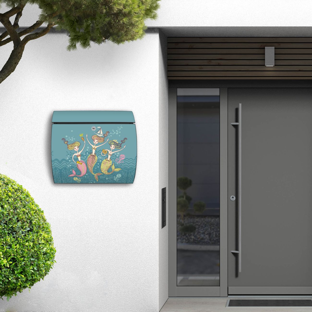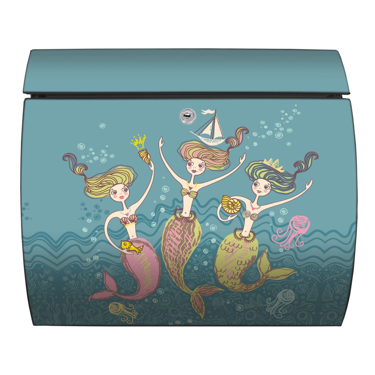 FUNKTION: DESIGN: Das Burg Wächter Modell Toscana mit Motiv Nixen hat ein sehr ansprechendes und zeitloses Design und ist besonderes wetterfest. Heben Sie Sich von der tristen grauen Masse ab, ohne auf Funktionalität zu verzichten. Wir bieten Ihnen ebenfalls Namensschilder, bereits beschriftet oder frei zu beschriften, und verschiedene selbst gestaltete Bitte-Keine-Werbung-Aufkleber. DETAILS: Der Postkasten besteht aus vollflächig verzinktem Stahl welcher in Anthrazit oder Weiß lackiert wurde oder aus Edelstahl (je nach gewählter Variante). Das Motiv besteht aus einer wetter- und UV-festen Folie, die mit einem Schutzlaminat überzogen ist, durch die Ihren Briefkasten zusätzlich vor Kratzern geschützt ist und auf den Briefkasten kaschiert wurde. Sie erhalten zu Ihrem neuen Design Briefkasten 2 Schlüssel sowie das passende Montagematerial. BANJADO: Ihr Briefkasten wird von Burg Wächter in Deutschland gefertigt und in unserer kleinen Manufaktur von Hand veredelt. Die Motivfolie ist lösungsmittelfrei und schutzlaminiert, dies sorgt für einen langen Halt. Wir legen großen Wert auf die Verbindung von Funktionalität und Design. Sie erhalten besondere Handarbeit aus Sachsen und Made in Germany.