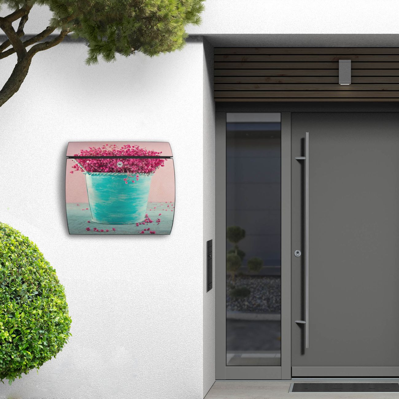 FUNKTION: DESIGN: Das Burg Wächter Modell Toscana mit Motiv Pinke Trockenblumen hat ein sehr ansprechendes und zeitloses Design und ist besonderes wetterfest. Heben Sie Sich von der tristen grauen Masse ab, ohne auf Funktionalität zu verzichten. Wir bieten Ihnen ebenfalls Namensschilder, bereits beschriftet oder frei zu beschriften, und verschiedene selbst gestaltete Bitte-Keine-Werbung-Aufkleber. DETAILS: Der Postkasten besteht aus vollflächig verzinktem Stahl welcher in Anthrazit oder Weiß lackiert wurde oder aus Edelstahl (je nach gewählter Variante). Das Motiv besteht aus einer wetter- und UV-festen Folie, die mit einem Schutzlaminat überzogen ist, durch die Ihren Briefkasten zusätzlich vor Kratzern geschützt ist und auf den Briefkasten kaschiert wurde. Sie erhalten zu Ihrem neuen Design Briefkasten 2 Schlüssel sowie das passende Montagematerial. BANJADO: Ihr Briefkasten wird von Burg Wächter in Deutschland gefertigt und in unserer kleinen Manufaktur von Hand veredelt. Die Motivfolie ist lösungsmittelfrei und schutzlaminiert, dies sorgt für einen langen Halt. Wir legen großen Wert auf die Verbindung von Funktionalität und Design. Sie erhalten besondere Handarbeit aus Sachsen und Made in Germany.