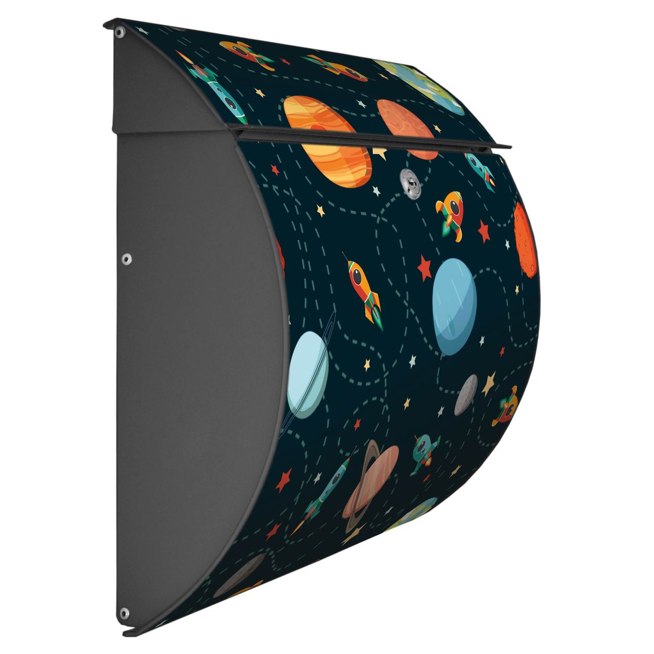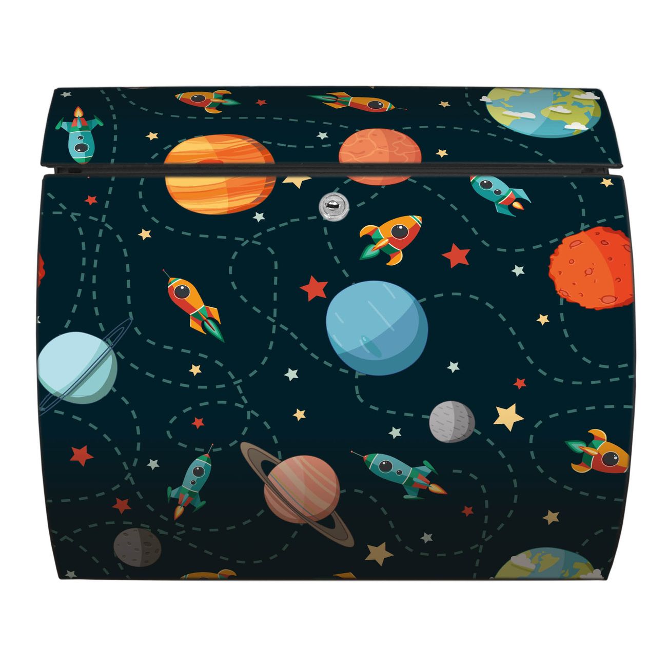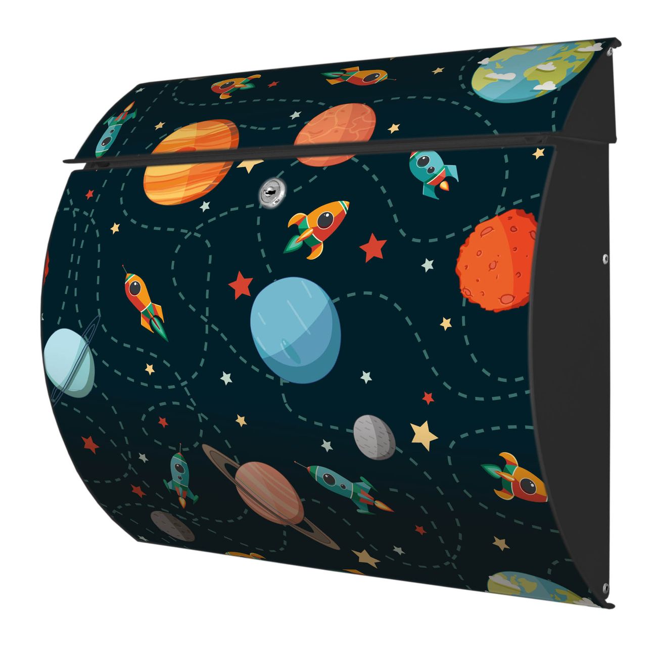 FUNKTION: DESIGN: Das Burg Wächter Modell Toscana mit Motiv Planet Cruiser hat ein sehr ansprechendes und zeitloses Design und ist besonderes wetterfest. Heben Sie Sich von der tristen grauen Masse ab, ohne auf Funktionalität zu verzichten. Wir bieten Ihnen ebenfalls Namensschilder, bereits beschriftet oder frei zu beschriften, und verschiedene selbst gestaltete Bitte-Keine-Werbung-Aufkleber. DETAILS: Der Postkasten besteht aus vollflächig verzinktem Stahl welcher in Anthrazit oder Weiß lackiert wurde oder aus Edelstahl (je nach gewählter Variante). Das Motiv besteht aus einer wetter- und UV-festen Folie, die mit einem Schutzlaminat überzogen ist, durch die Ihren Briefkasten zusätzlich vor Kratzern geschützt ist und auf den Briefkasten kaschiert wurde. Sie erhalten zu Ihrem neuen Design Briefkasten 2 Schlüssel sowie das passende Montagematerial. BANJADO: Ihr Briefkasten wird von Burg Wächter in Deutschland gefertigt und in unserer kleinen Manufaktur von Hand veredelt. Die Motivfolie ist lösungsmittelfrei und schutzlaminiert, dies sorgt für einen langen Halt. Wir legen großen Wert auf die Verbindung von Funktionalität und Design. Sie erhalten besondere Handarbeit aus Sachsen und Made in Germany.