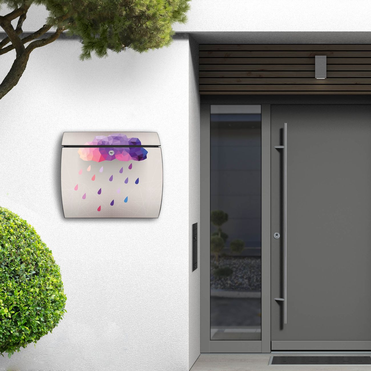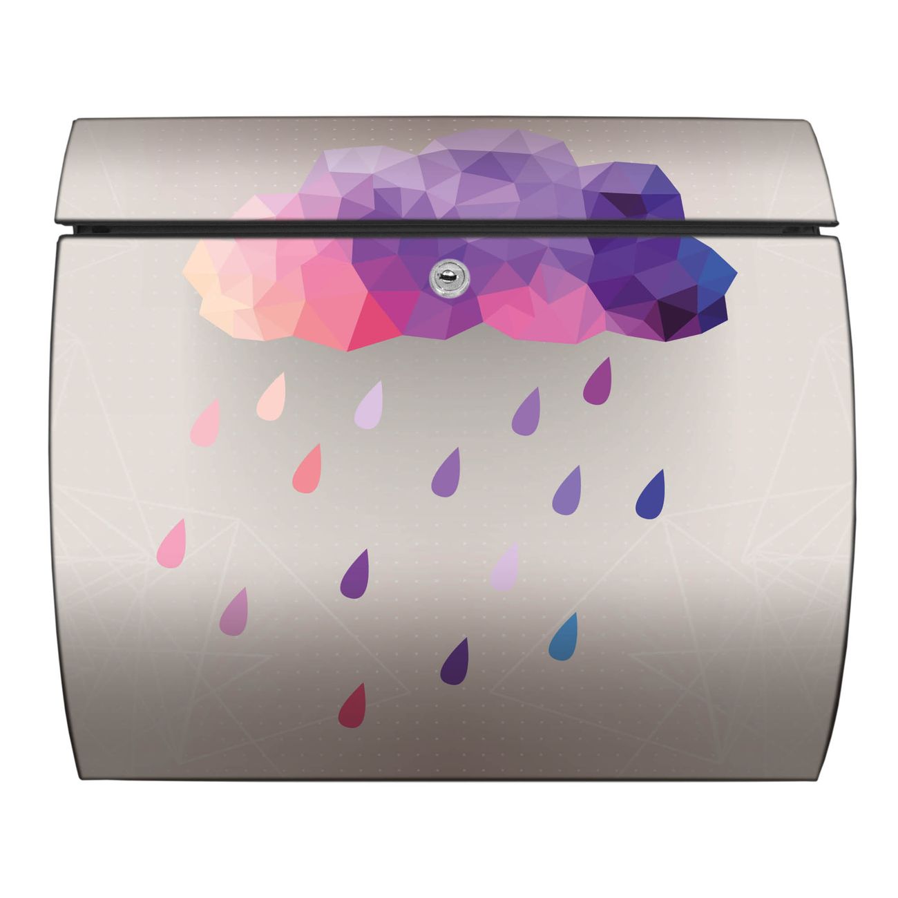 FUNKTION: DESIGN: Das Burg Wächter Modell Toscana mit Motiv Regenwolke hat ein sehr ansprechendes und zeitloses Design und ist besonderes wetterfest. Heben Sie Sich von der tristen grauen Masse ab, ohne auf Funktionalität zu verzichten. Wir bieten Ihnen ebenfalls Namensschilder, bereits beschriftet oder frei zu beschriften, und verschiedene selbst gestaltete Bitte-Keine-Werbung-Aufkleber. DETAILS: Der Postkasten besteht aus vollflächig verzinktem Stahl welcher in Anthrazit oder Weiß lackiert wurde oder aus Edelstahl (je nach gewählter Variante). Das Motiv besteht aus einer wetter- und UV-festen Folie, die mit einem Schutzlaminat überzogen ist, durch die Ihren Briefkasten zusätzlich vor Kratzern geschützt ist und auf den Briefkasten kaschiert wurde. Sie erhalten zu Ihrem neuen Design Briefkasten 2 Schlüssel sowie das passende Montagematerial. BANJADO: Ihr Briefkasten wird von Burg Wächter in Deutschland gefertigt und in unserer kleinen Manufaktur von Hand veredelt. Die Motivfolie ist lösungsmittelfrei und schutzlaminiert, dies sorgt für einen langen Halt. Wir legen großen Wert auf die Verbindung von Funktionalität und Design. Sie erhalten besondere Handarbeit aus Sachsen und Made in Germany.