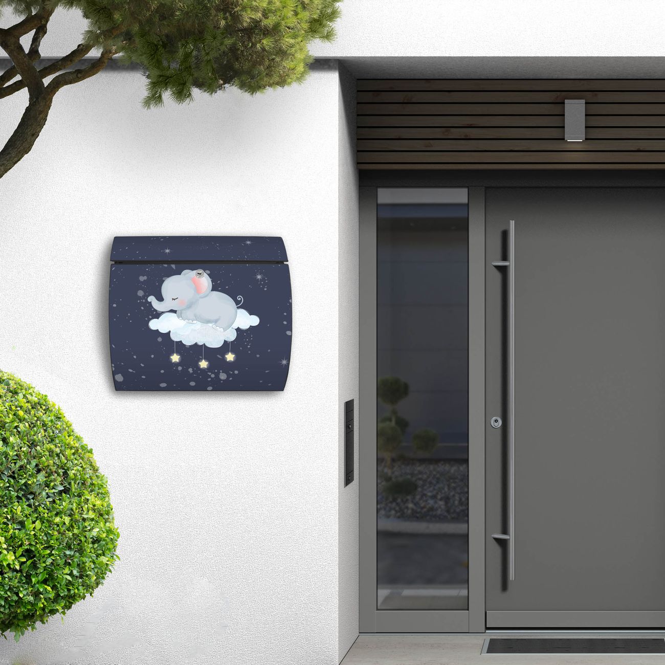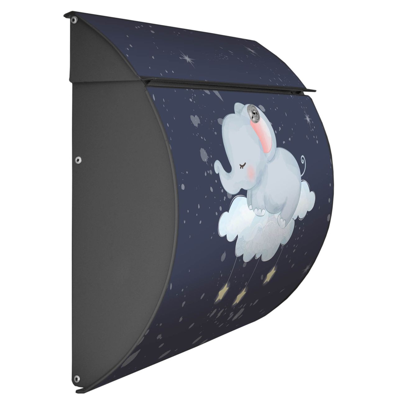FUNKTION: DESIGN: Das Burg Wächter Modell Toscana mit Motiv schlafender Elefant hat ein sehr ansprechendes und zeitloses Design und ist besonderes wetterfest. Heben Sie Sich von der tristen grauen Masse ab, ohne auf Funktionalität zu verzichten. Wir bieten Ihnen ebenfalls Namensschilder, bereits beschriftet oder frei zu beschriften, und verschiedene selbst gestaltete Bitte-Keine-Werbung-Aufkleber. DETAILS: Der Postkasten besteht aus vollflächig verzinktem Stahl welcher in Anthrazit oder Weiß lackiert wurde oder aus Edelstahl (je nach gewählter Variante). Das Motiv besteht aus einer wetter- und UV-festen Folie, die mit einem Schutzlaminat überzogen ist, durch die Ihren Briefkasten zusätzlich vor Kratzern geschützt ist und auf den Briefkasten kaschiert wurde. Sie erhalten zu Ihrem neuen Design Briefkasten 2 Schlüssel sowie das passende Montagematerial. BANJADO: Ihr Briefkasten wird von Burg Wächter in Deutschland gefertigt und in unserer kleinen Manufaktur von Hand veredelt. Die Motivfolie ist lösungsmittelfrei und schutzlaminiert, dies sorgt für einen langen Halt. Wir legen großen Wert auf die Verbindung von Funktionalität und Design. Sie erhalten besondere Handarbeit aus Sachsen und Made in Germany.