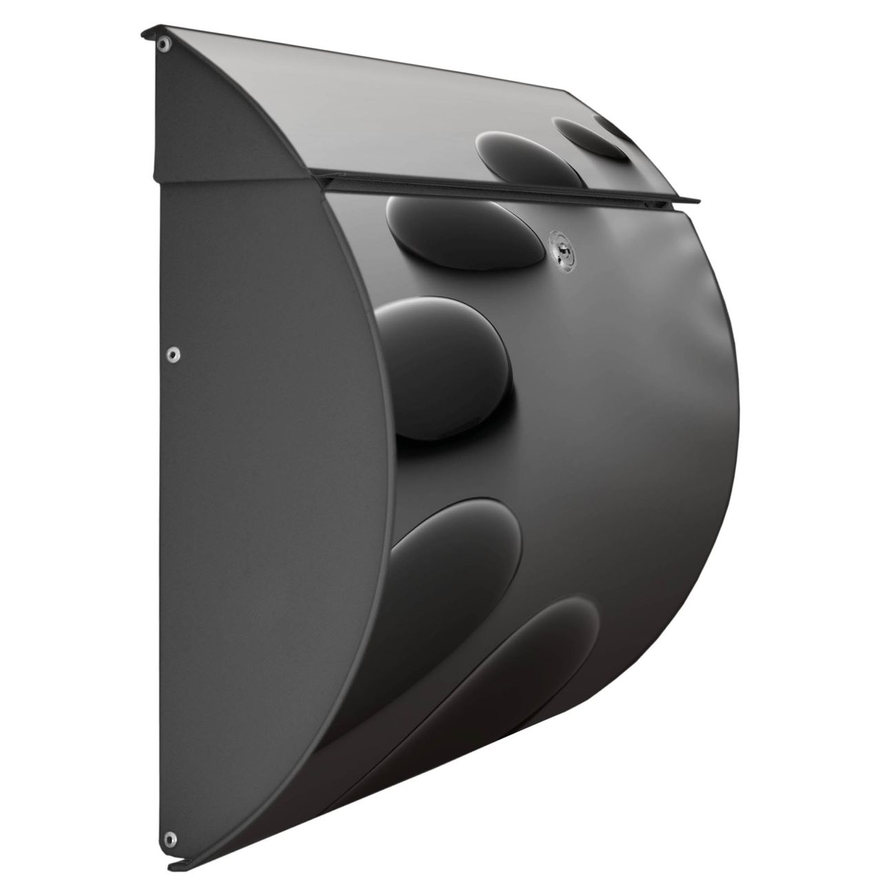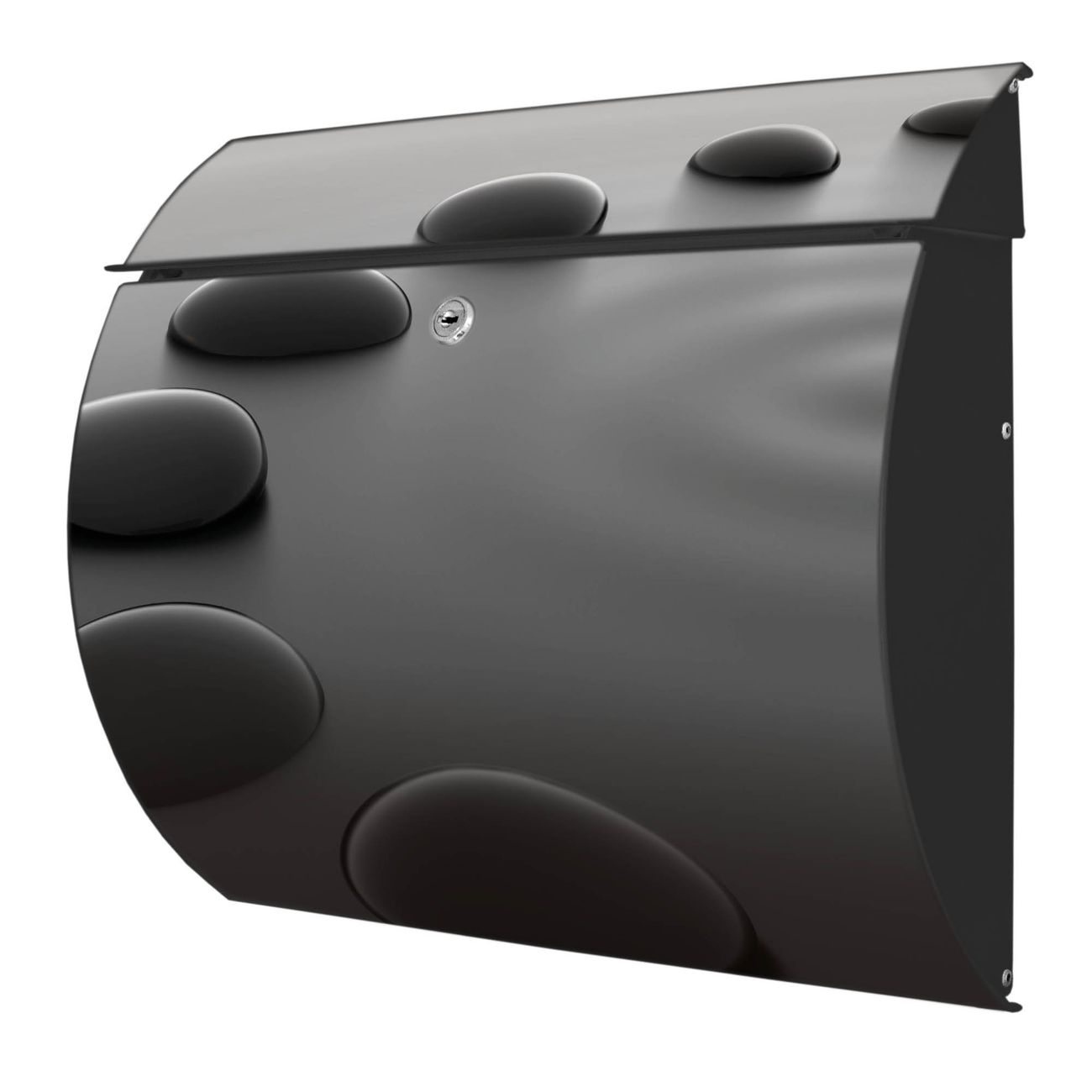Der geschwungene Burg Wächter Briefkasten Toscana mit Motiv Schwarze Steine bietet Ihnen mit seinem großen Fassungsvermögen genügend Platz auch für große A4 Sendungen. Auf Wunsch können Sie bei uns den passenden Standfuß bestellen und so aus dem Wandbriefkasten einen Standbriefkasten machen. Der integrierte Öffnungsstopp ermöglicht eine einfache Handhabung beim Entnehmen der Post.