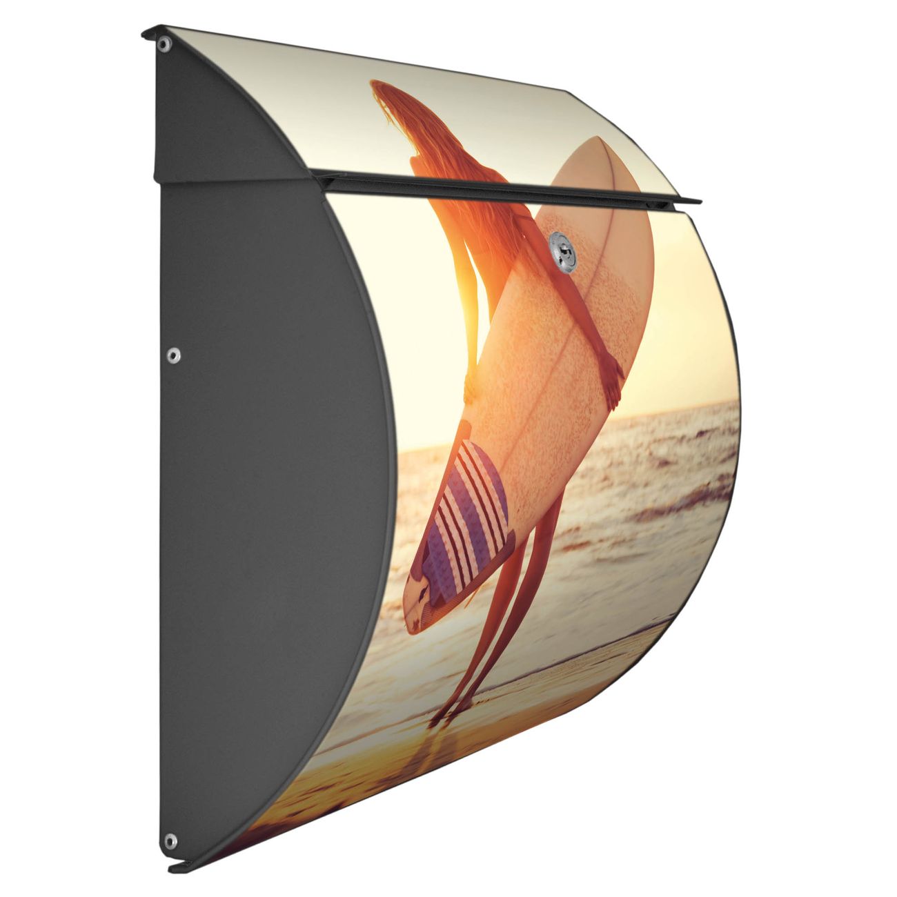 FUNKTION: DESIGN: Das Burg Wächter Modell Toscana mit Motiv Surfer Girl hat ein sehr ansprechendes und zeitloses Design und ist besonderes wetterfest. Heben Sie Sich von der tristen grauen Masse ab, ohne auf Funktionalität zu verzichten. Wir bieten Ihnen ebenfalls Namensschilder, bereits beschriftet oder frei zu beschriften, und verschiedene selbst gestaltete Bitte-Keine-Werbung-Aufkleber. DETAILS: Der Postkasten besteht aus vollflächig verzinktem Stahl welcher in Anthrazit oder Weiß lackiert wurde oder aus Edelstahl (je nach gewählter Variante). Das Motiv besteht aus einer wetter- und UV-festen Folie, die mit einem Schutzlaminat überzogen ist, durch die Ihren Briefkasten zusätzlich vor Kratzern geschützt ist und auf den Briefkasten kaschiert wurde. Sie erhalten zu Ihrem neuen Design Briefkasten 2 Schlüssel sowie das passende Montagematerial. BANJADO: Ihr Briefkasten wird von Burg Wächter in Deutschland gefertigt und in unserer kleinen Manufaktur von Hand veredelt. Die Motivfolie ist lösungsmittelfrei und schutzlaminiert, dies sorgt für einen langen Halt. Wir legen großen Wert auf die Verbindung von Funktionalität und Design. Sie erhalten besondere Handarbeit aus Sachsen und Made in Germany.