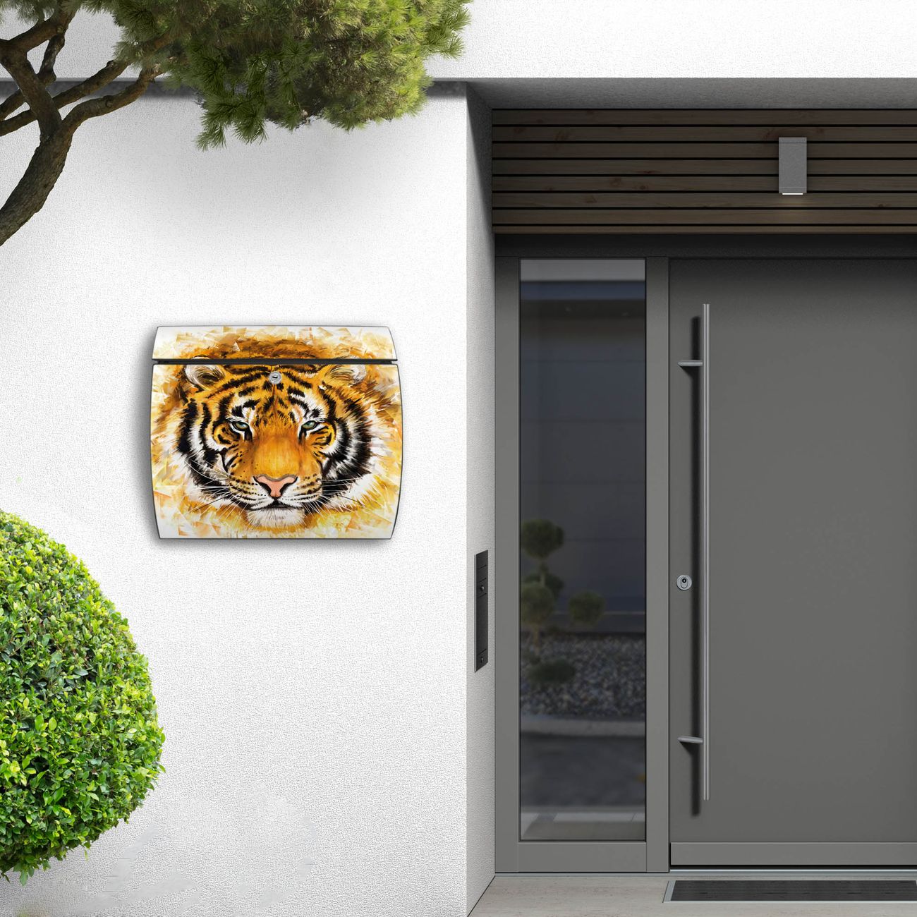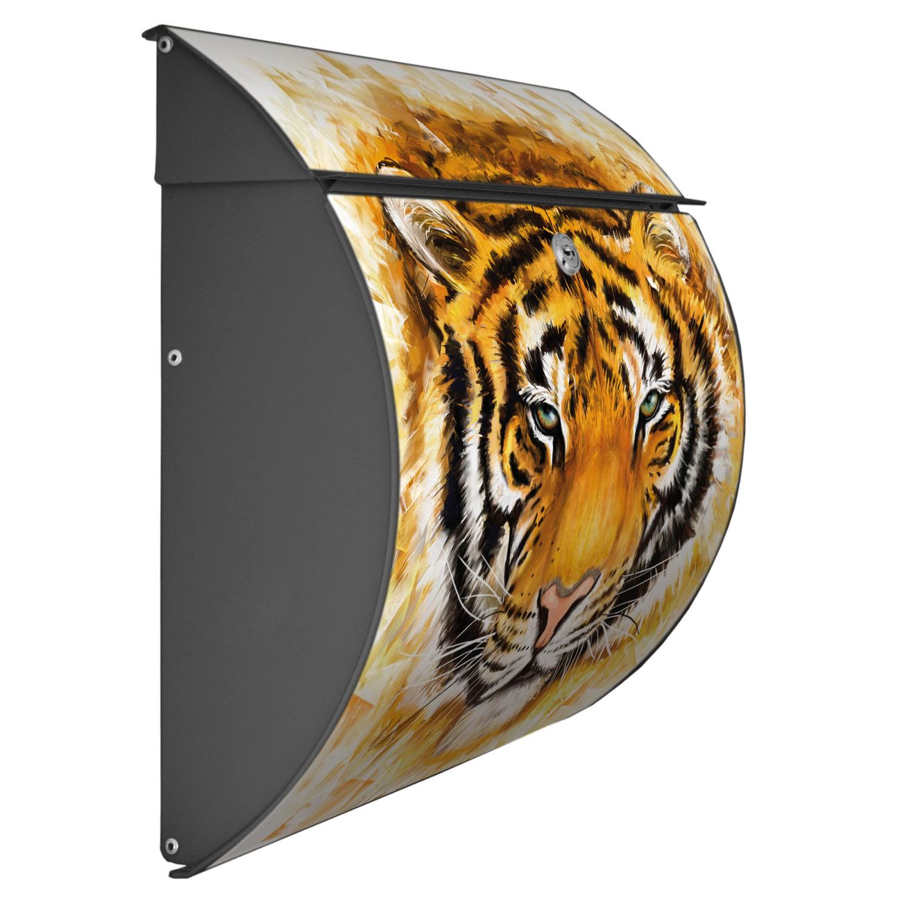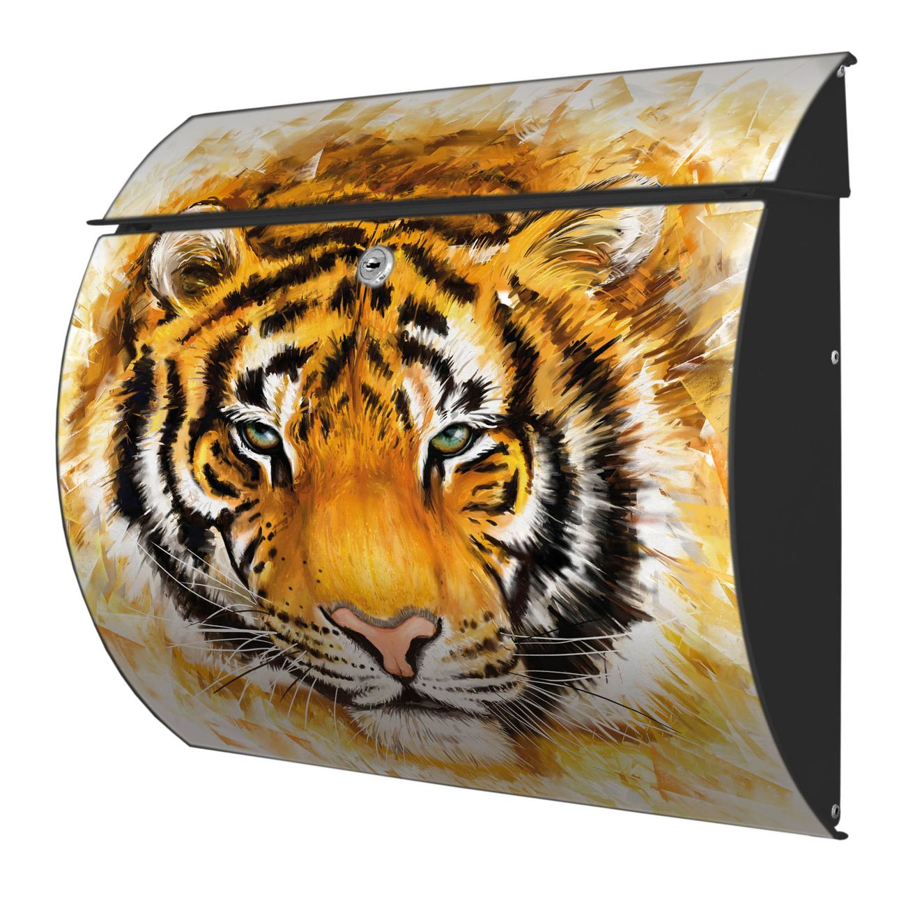 FUNKTION: DESIGN: Das Burg Wächter Modell Toscana mit Motiv Tigerkopf hat ein sehr ansprechendes und zeitloses Design und ist besonderes wetterfest. Heben Sie Sich von der tristen grauen Masse ab, ohne auf Funktionalität zu verzichten. Wir bieten Ihnen ebenfalls Namensschilder, bereits beschriftet oder frei zu beschriften, und verschiedene selbst gestaltete Bitte-Keine-Werbung-Aufkleber. DETAILS: Der Postkasten besteht aus vollflächig verzinktem Stahl welcher in Anthrazit oder Weiß lackiert wurde oder aus Edelstahl (je nach gewählter Variante). Das Motiv besteht aus einer wetter- und UV-festen Folie, die mit einem Schutzlaminat überzogen ist, durch die Ihren Briefkasten zusätzlich vor Kratzern geschützt ist und auf den Briefkasten kaschiert wurde. Sie erhalten zu Ihrem neuen Design Briefkasten 2 Schlüssel sowie das passende Montagematerial. BANJADO: Ihr Briefkasten wird von Burg Wächter in Deutschland gefertigt und in unserer kleinen Manufaktur von Hand veredelt. Die Motivfolie ist lösungsmittelfrei und schutzlaminiert, dies sorgt für einen langen Halt. Wir legen großen Wert auf die Verbindung von Funktionalität und Design. Sie erhalten besondere Handarbeit aus Sachsen und Made in Germany.