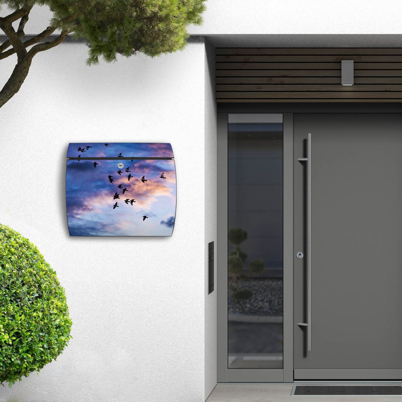 Der geschwungene Burg Wächter Briefkasten Toscana mit Motiv Vögel am Himmel 3 bietet Ihnen mit seinem großen Fassungsvermögen genügend Platz auch für große A4 Sendungen. Auf Wunsch können Sie bei uns den passenden Standfuß bestellen und so aus dem Wandbriefkasten einen Standbriefkasten machen. Der integrierte Öffnungsstopp ermöglicht eine einfache Handhabung beim Entnehmen der Post.
