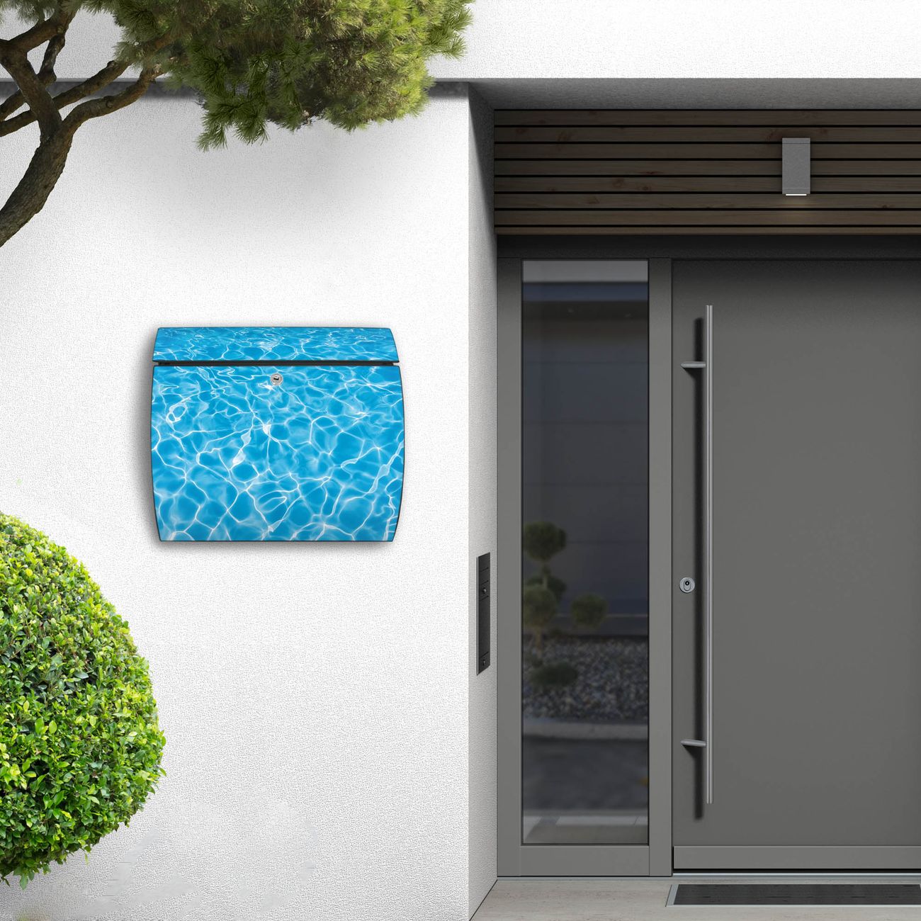 FUNKTION: DESIGN: Das Burg Wächter Modell Toscana mit Motiv Wasseroberfläche hat ein sehr ansprechendes und zeitloses Design und ist besonderes wetterfest. Heben Sie Sich von der tristen grauen Masse ab, ohne auf Funktionalität zu verzichten. Wir bieten Ihnen ebenfalls Namensschilder, bereits beschriftet oder frei zu beschriften, und verschiedene selbst gestaltete Bitte-Keine-Werbung-Aufkleber. DETAILS: Der Postkasten besteht aus vollflächig verzinktem Stahl welcher in Anthrazit oder Weiß lackiert wurde oder aus Edelstahl (je nach gewählter Variante). Das Motiv besteht aus einer wetter- und UV-festen Folie, die mit einem Schutzlaminat überzogen ist, durch die Ihren Briefkasten zusätzlich vor Kratzern geschützt ist und auf den Briefkasten kaschiert wurde. Sie erhalten zu Ihrem neuen Design Briefkasten 2 Schlüssel sowie das passende Montagematerial. BANJADO: Ihr Briefkasten wird von Burg Wächter in Deutschland gefertigt und in unserer kleinen Manufaktur von Hand veredelt. Die Motivfolie ist lösungsmittelfrei und schutzlaminiert, dies sorgt für einen langen Halt. Wir legen großen Wert auf die Verbindung von Funktionalität und Design. Sie erhalten besondere Handarbeit aus Sachsen und Made in Germany.