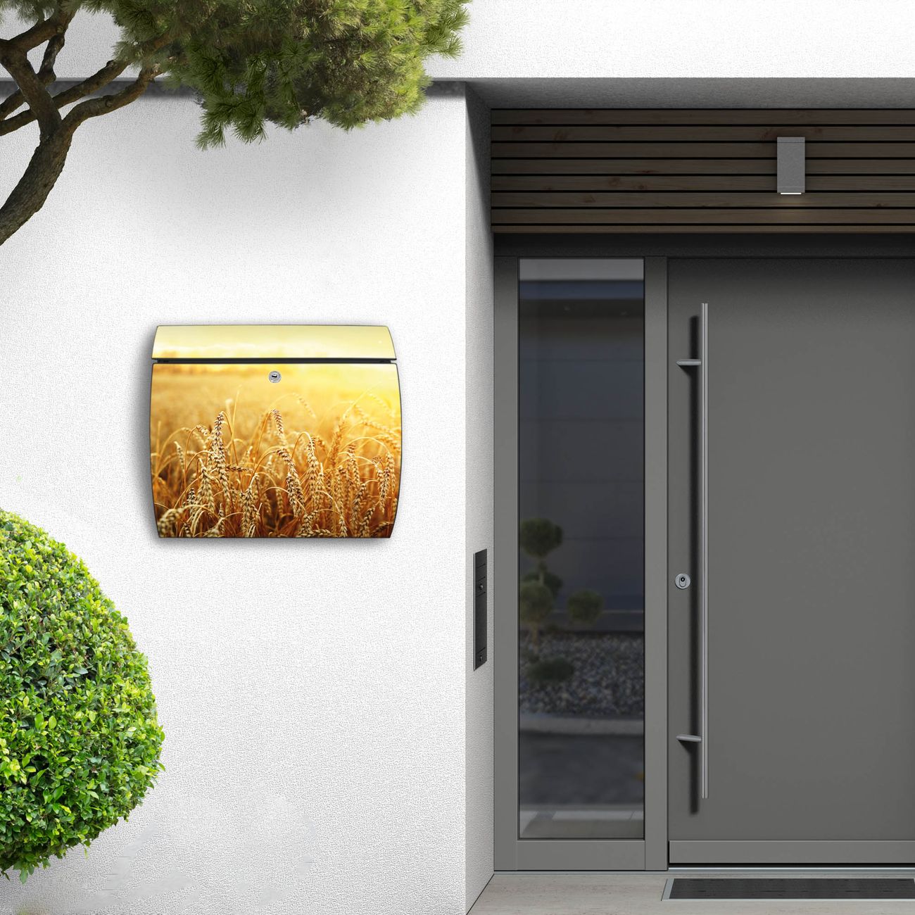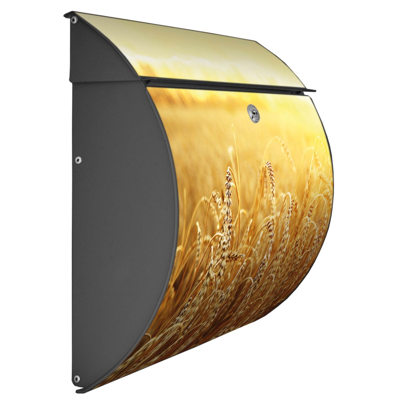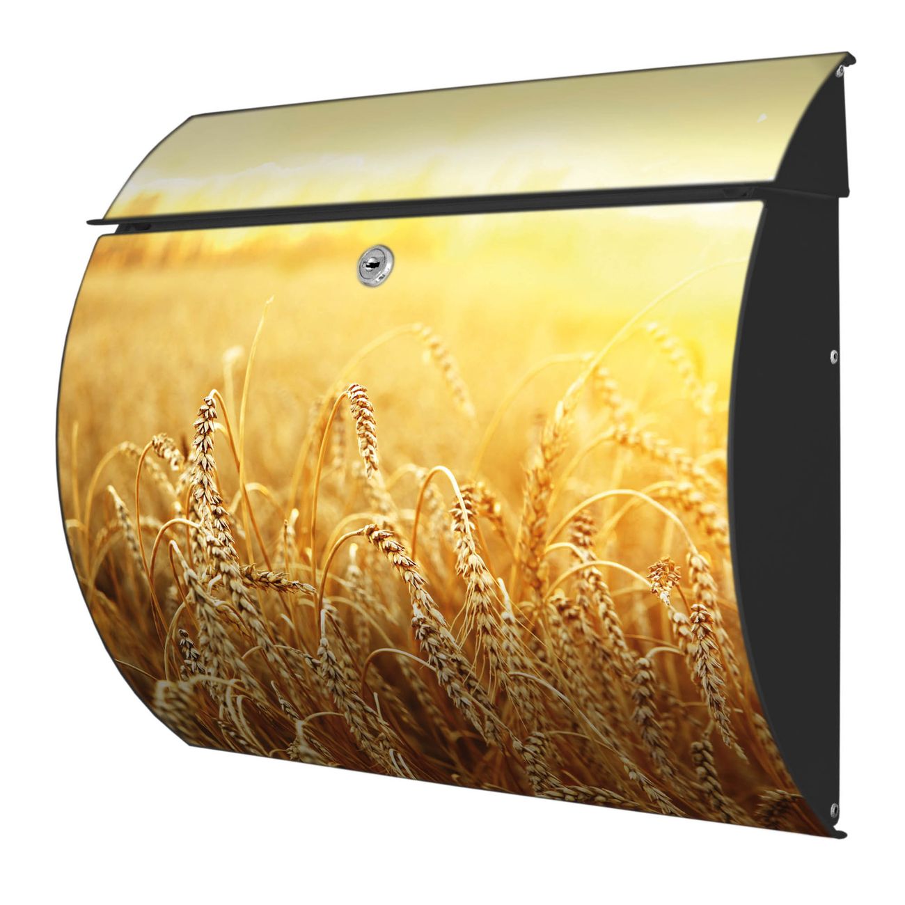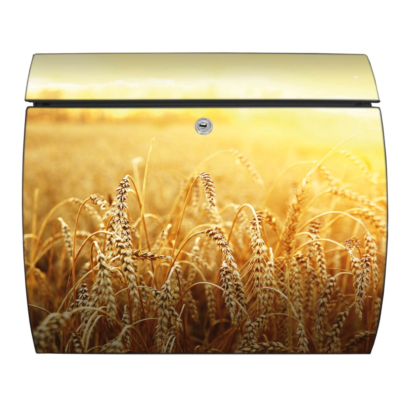 FUNKTION: DESIGN: Das Burg Wächter Modell Toscana mit Motiv Weizenfeld hat ein sehr ansprechendes und zeitloses Design und ist besonderes wetterfest. Heben Sie Sich von der tristen grauen Masse ab, ohne auf Funktionalität zu verzichten. Wir bieten Ihnen ebenfalls Namensschilder, bereits beschriftet oder frei zu beschriften, und verschiedene selbst gestaltete Bitte-Keine-Werbung-Aufkleber. DETAILS: Der Postkasten besteht aus vollflächig verzinktem Stahl welcher in Anthrazit oder Weiß lackiert wurde oder aus Edelstahl (je nach gewählter Variante). Das Motiv besteht aus einer wetter- und UV-festen Folie, die mit einem Schutzlaminat überzogen ist, durch die Ihren Briefkasten zusätzlich vor Kratzern geschützt ist und auf den Briefkasten kaschiert wurde. Sie erhalten zu Ihrem neuen Design Briefkasten 2 Schlüssel sowie das passende Montagematerial. BANJADO: Ihr Briefkasten wird von Burg Wächter in Deutschland gefertigt und in unserer kleinen Manufaktur von Hand veredelt. Die Motivfolie ist lösungsmittelfrei und schutzlaminiert, dies sorgt für einen langen Halt. Wir legen großen Wert auf die Verbindung von Funktionalität und Design. Sie erhalten besondere Handarbeit aus Sachsen und Made in Germany.